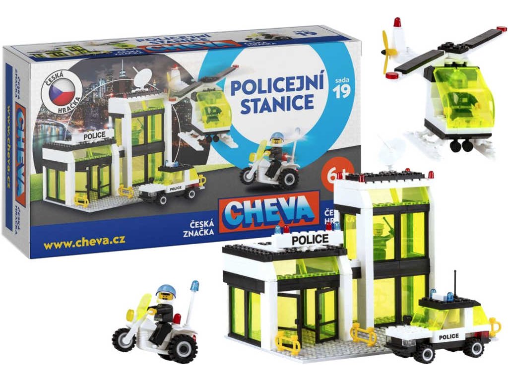 CHEVA Policejní stanice.Chceš mít doma opravdovou policejní stanici? Tak neváhej a dej se do skládání! Sestav si také policejní auto, motorku nebo vrtulník. Součástí balení je podrobný návod na sestavení