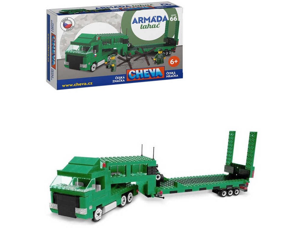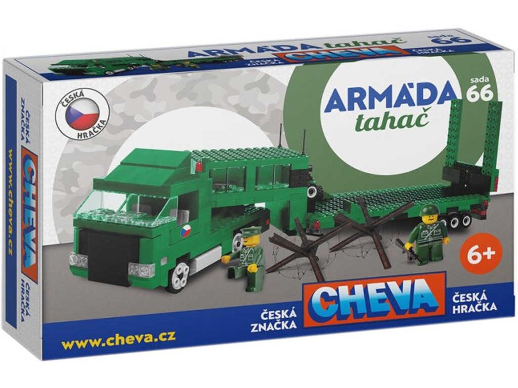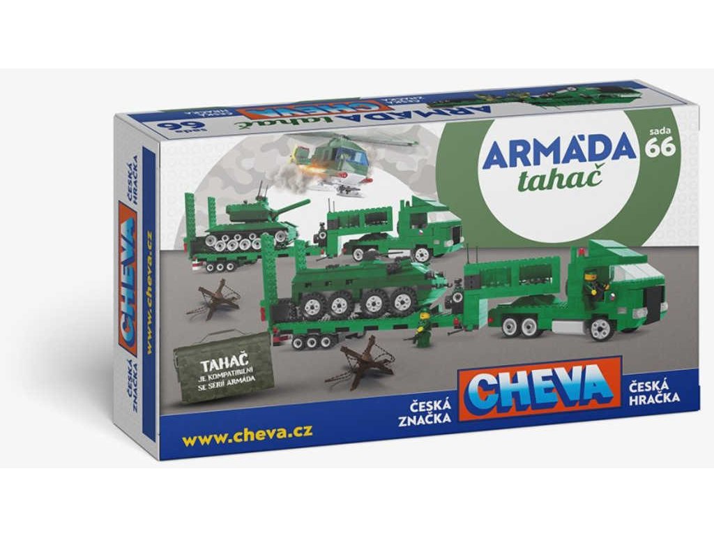 CHEVA 66 Tahač z produktové řady ArmádaTato zbrusu nová sada je dalším z doplňků k základním verzím stavebnice Cheva. Balení obsahuje více jak 500 dílků, z nichž lze sestavit Tahač těžké vojenské techniky a přenést se tak do světa válečných bitev. Stavebnice je vyrobena z velmi kvalitního plastu.