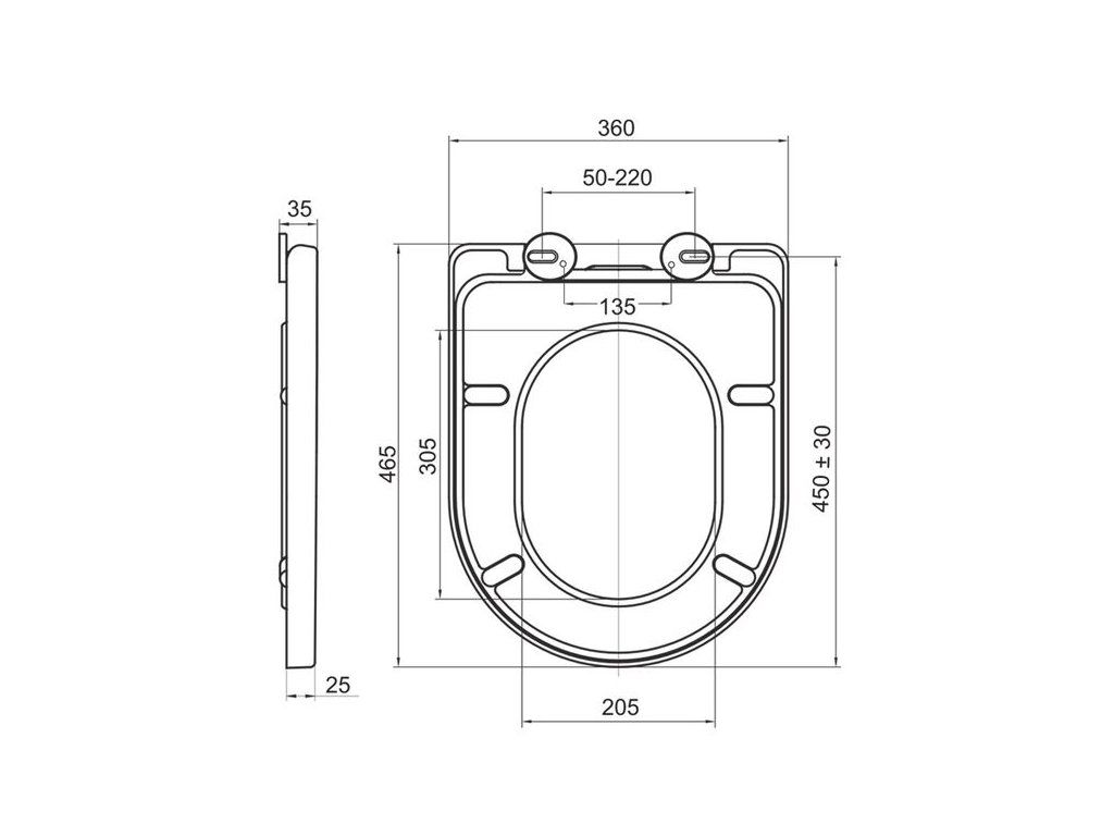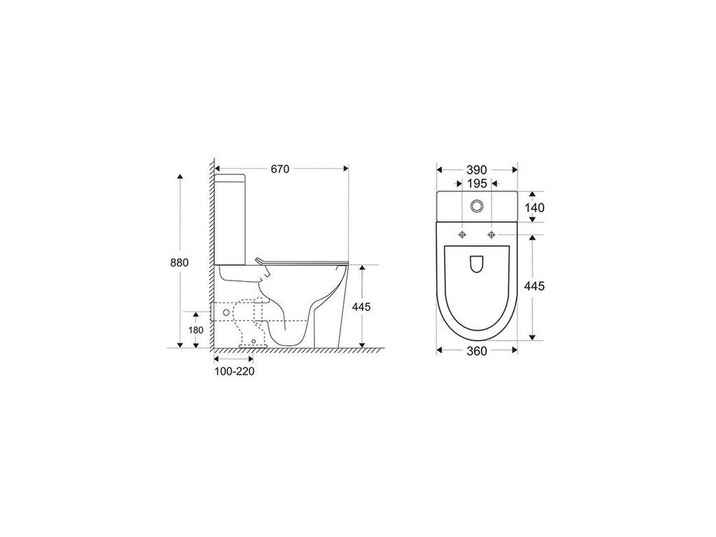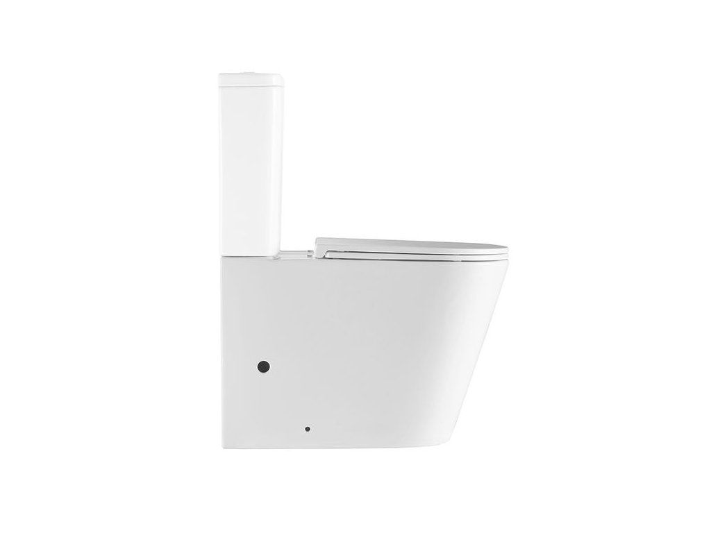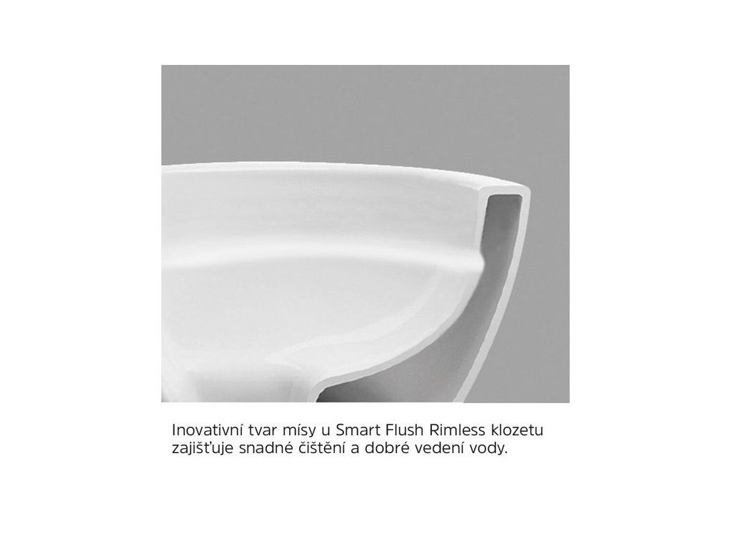 Kapotovaná vyvýšená WC mísa včetně sedátka a bez nádržky. Díky novému tvaru mísy odpadá složité čištění splachovacího žlábku pod okrajem mísy, který je používaný na klasických klozetech, a kde by se mohly hromadit bakterie, špína a usazeniny. Okruh Rimless, kterým toaleta disponuje, je promyšlený způsob vedení vody, který zajišťuje účinný oplach a také snadné čištění WC mísy.