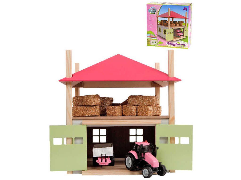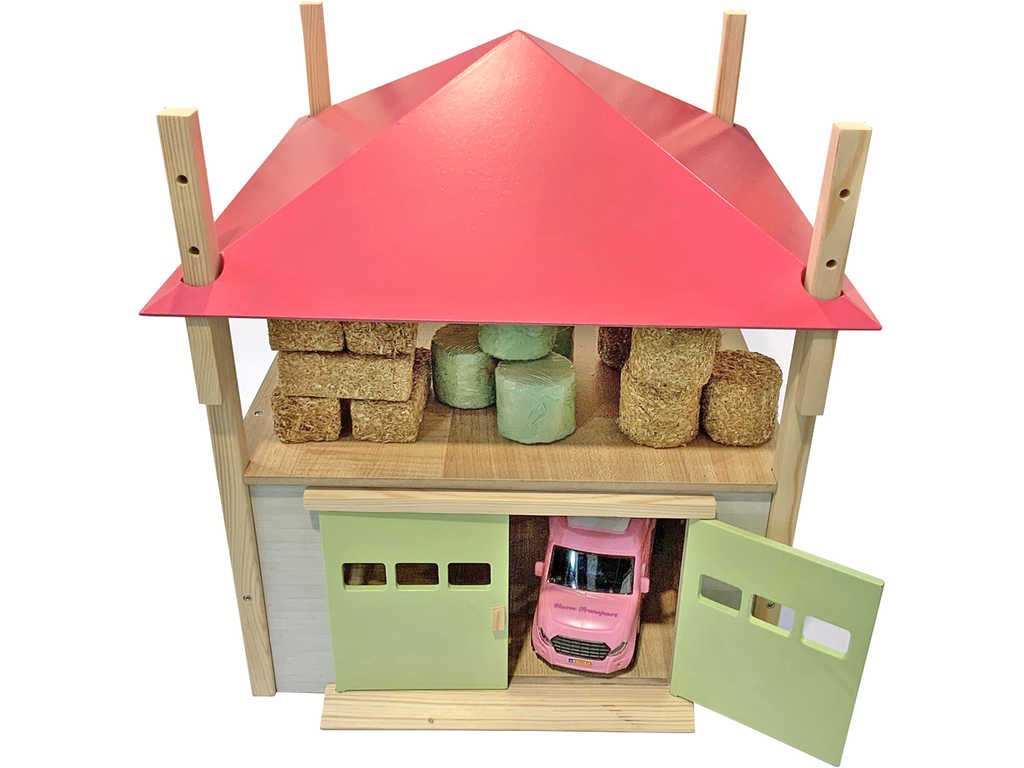 Seník/stodola 2v1 pro uschování všech tvých traktorů a sena pro všechna tvá zvířátka. Model je vyroben z kvalitního dřeva a oblíbí si jej každý malý farmář.Tato dřevěná stodola se zelenými dveřmi a seníkem je vhodná pro (pracovní) vozidla v měřítku 1:32 a uskladnění balíků se senem. Růžovou střechu lze nastavit do 3 různých výšek.