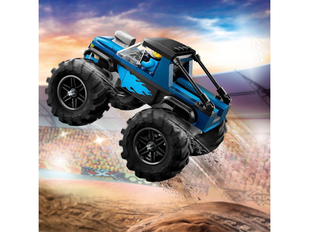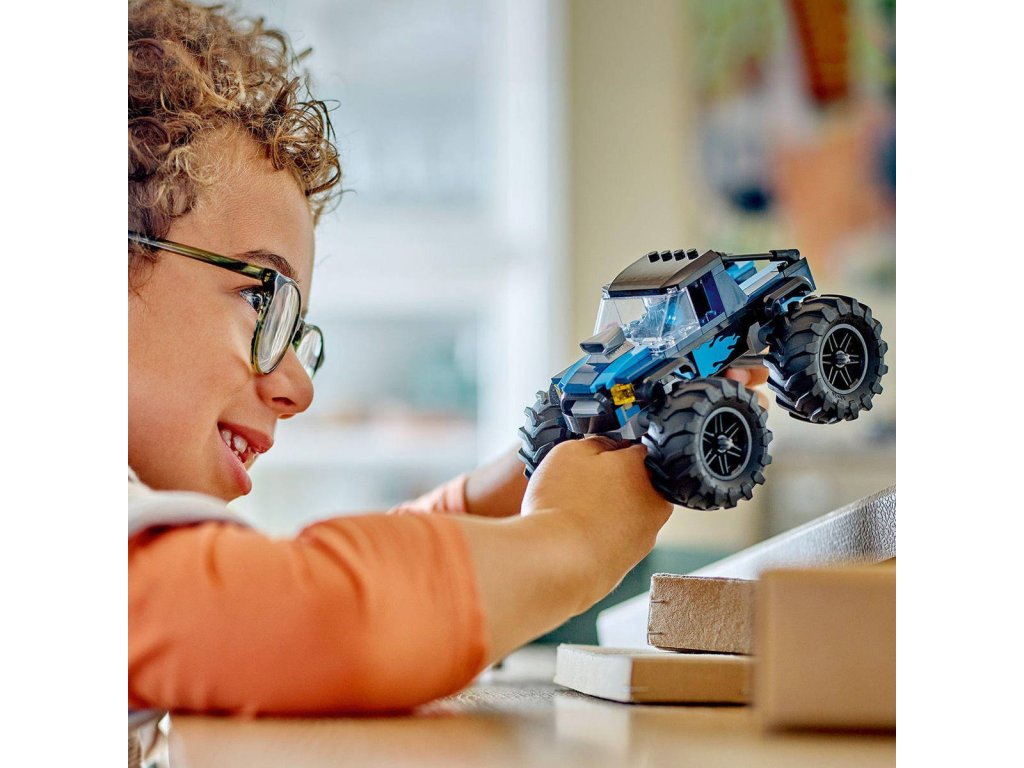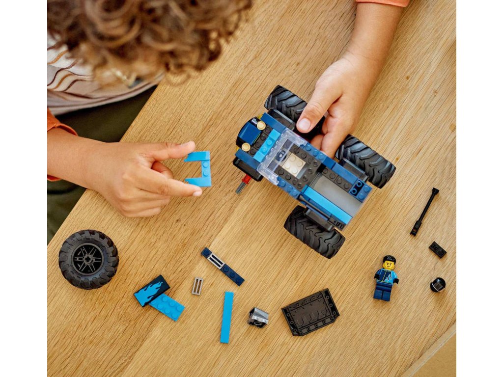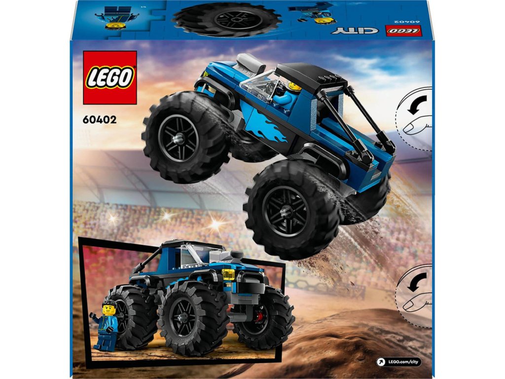 LEGO 60402: Modrý monster truck z produktové řady LEGO CITY - Dětské plastové kostky v krabici.Hledáte zajímavou herní stavebnici pro děti od 5 let? Sada Modrý monster truck je perfektní volba. Toto mohutné terénní vozidlo se může pochlubit obrovskými gumovými pneumatikami a robustní konstrukcí, která dokáže odolat i při akčním hraní. Vaše ratolesti si ho přímo zamilují a užijí si spoustu zábavy při rychlé jízdě a odvážných skocích. Součástí je také minifigurka řidiče k nápaditému hraní. Tato stavebnice monster trucku není jen skvělá hračka – děti čeká zábavný stavitelský zážitek se srozumitelným obrázkovým návodem na stavění a digitálním návodem v aplikaci LEGO Builder. Tento intuitivní pomocník při stavění umožní dětem prohlížet si modely ve 3D, navíc mohou sledovat postup stavění a prozkoumávat a ukládat virtuální stavebnice.