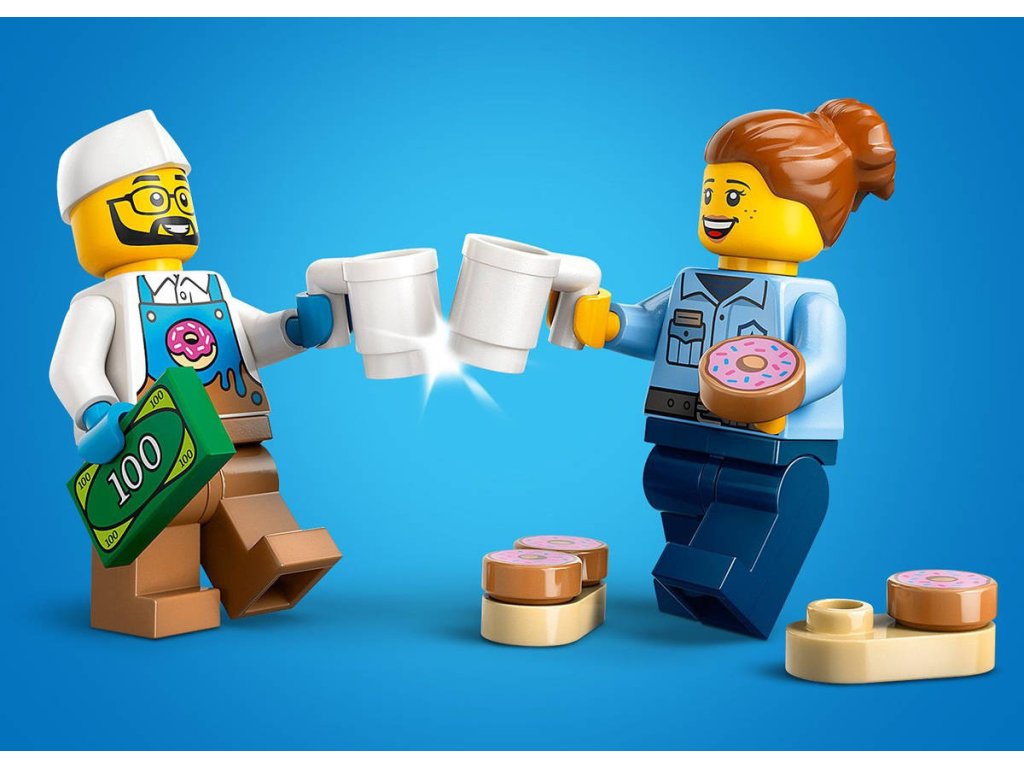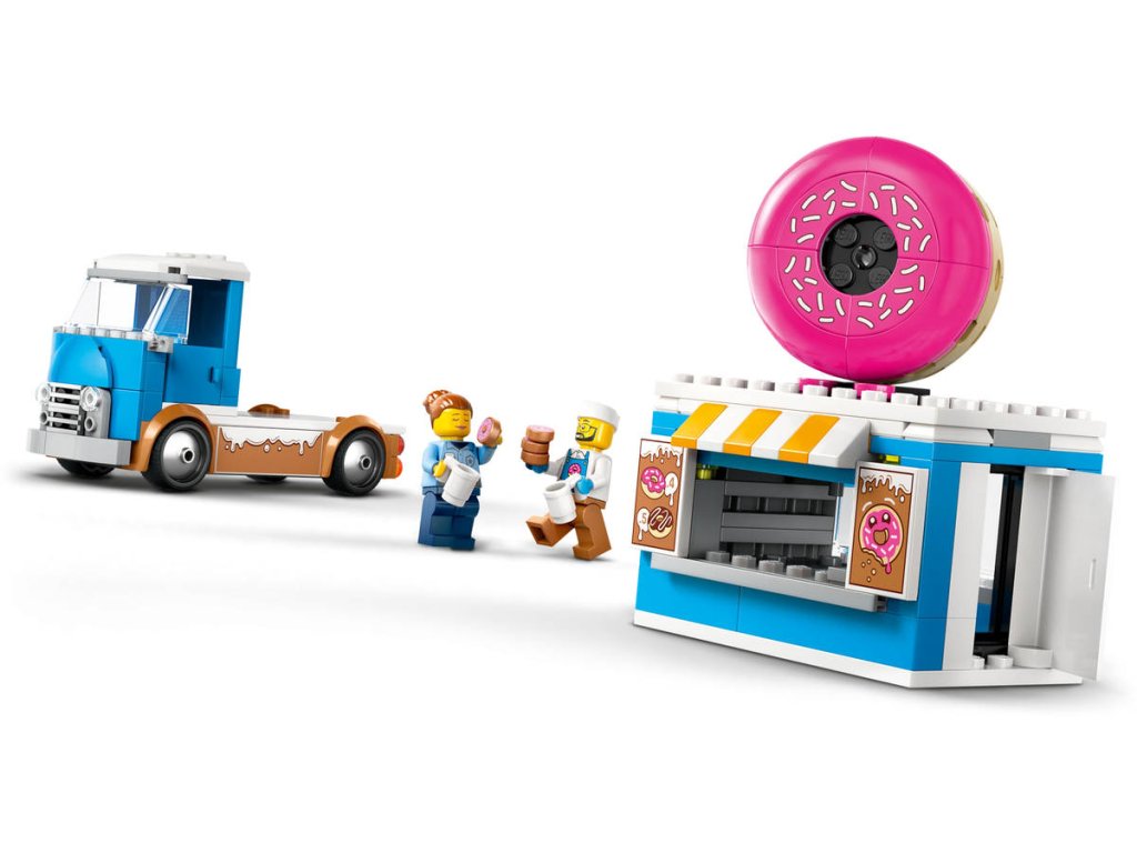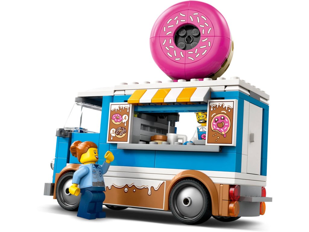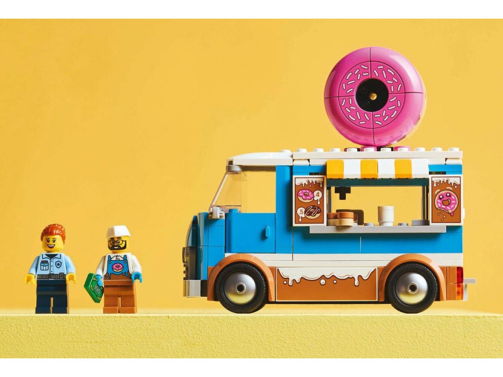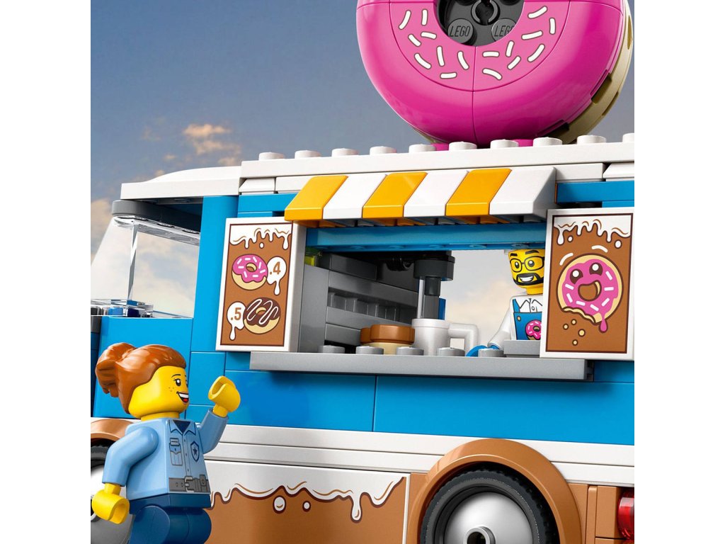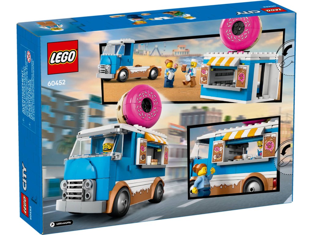 LEGO 60452 - Auto truck s donuty z produktové řady LEGO CITY - Dětská plastová stavebnice v krabici.Představujeme dokonalou automobilovou stavebnici pro milovníky sladkých dobrot od 5 let. Stavebnice Truck s donuty obsahuje dekoraci lahodné polevy, obří koblihu na střeše a bezbariérovou kuchyňku s kávovarem a pokladnou. Děti naservírují chutné koblihy a nápoje z obslužného okénka a po odpojení kiosku si užijí ještě více možností hraní. Stačí přidat minifigurky prodavače a zákazníka a zábava může začít! Návod na stavění mobilního obchodu s donuty LEGO najdete v krabici – nebo si stáhněte aplikaci LEGO Builder, která dětem umožní prozkoumávat a ukládat si virtuální stavebnice, sledovat postup stavění a přibližovat, otáčet a prohlížet si modely ze všech úhlů, zatímco na nich pracují.