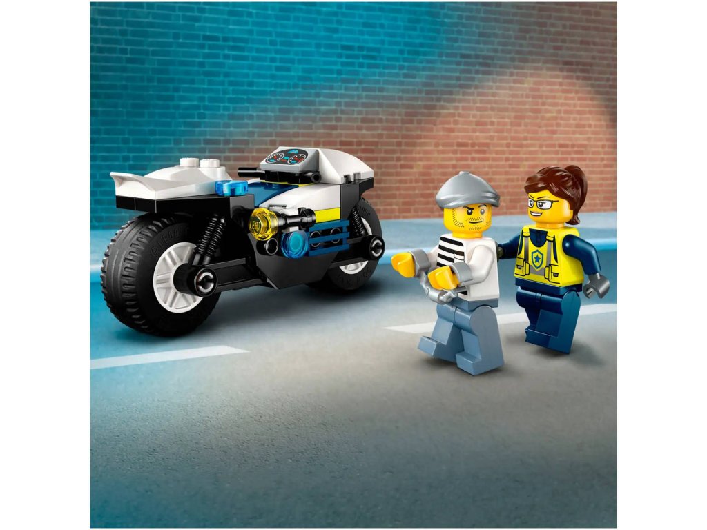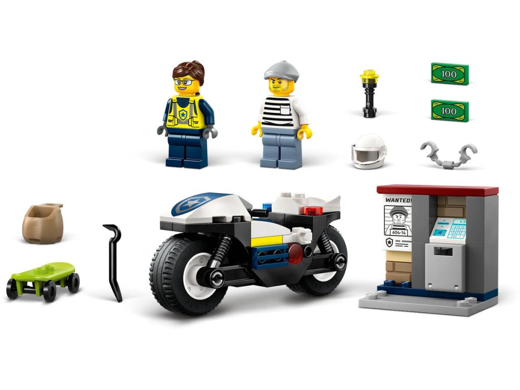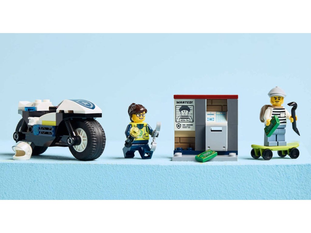 LEGO 60455 - Honička na policejní motorce z produktové řady LEGO CITY - Kvalitní dětská plastová stavebnice v krabici.Překvapte svého mladého akčního hrdinu touto vzrušující stavebnicí Policejní honička na motorce. Je ideální pro malé stavitele od 4 let a nabízí parádní policejní motorku se širokými pneumatikami, zlodějův skateboard a otevírací minibankomat s bankovkou. Stačí přidat minifigurky policisty a zloděje a můžete si užít hodiny nápaditého hraní a vyprávění příběhů. Tato snadno sestavitelná policejní stavebnice obsahuje začátečnickou kostku LEGO a obrázkový návod, který vás provede stavěním – nebo se můžete se svým malým hrdinou vydat na napínavou stavitelskou cestu s digitálním návodem v aplikaci LEGO Builder. Děti si v ní můžou přibližovat a otáčet modely ve 3D, sledovat postup stavění a objevovat a ukládat si další stavebnice.
