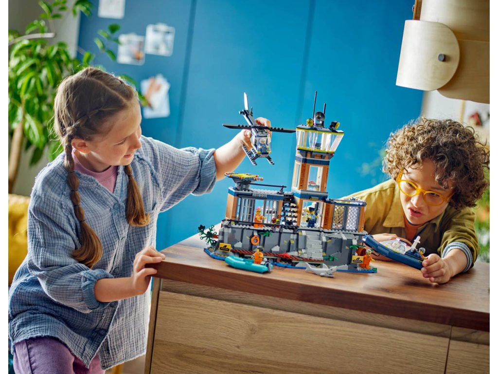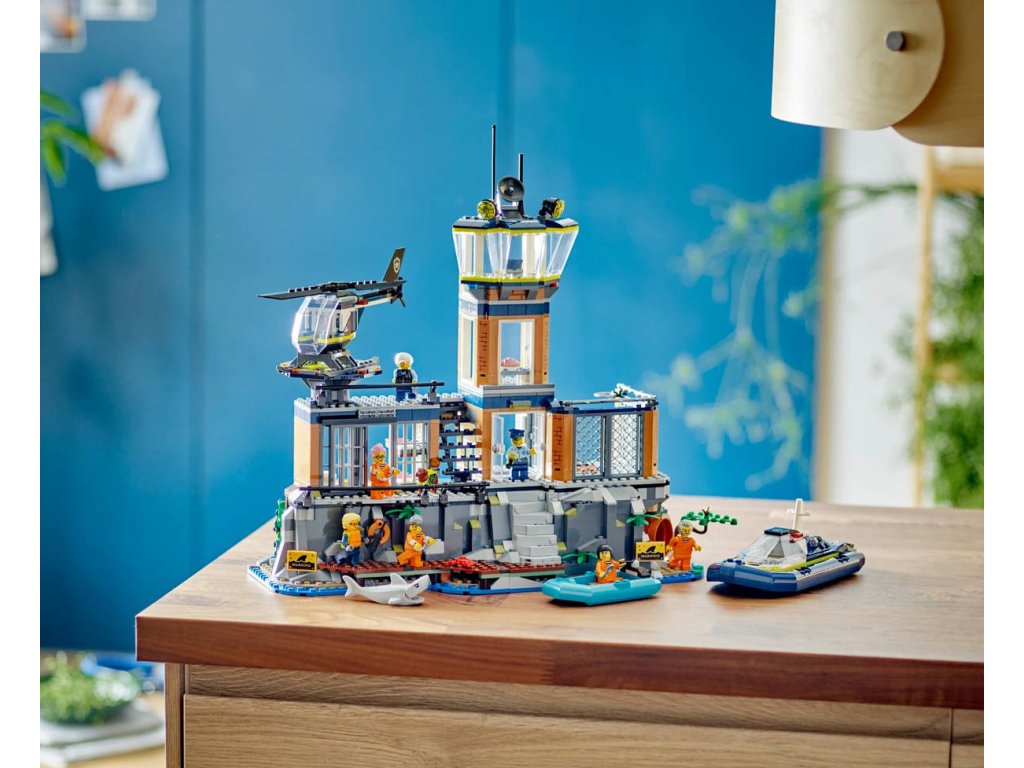 LEGO 60419 - Policie a vězení na ostrově z produktové řady LEGO CITY - Dětské plastové kostky v krabici.Stavebnice Policie a vězení na ostrově je domovem nejznámějších zločinců ve městě, kteří ale mají jiné plány! S touto úžasnou herní stavebnicí, která obsahuje vězení na útesu plné funkcí a nejrůznějších prvků, vás čekají dobrodružství plná akce. Obsahuje také vrtulník, policejní člun, člun, 3 minifigurky policistů a 4 minifigurky vězňů, a navíc figurky policejního psa a žraloka. Stavebnice s ostrovem vězňů je plná interiérových detailů pro nápadité hraní, včetně řídicí místnosti, odpočívárny pro policisty, vstupní haly, dvora s tajným únikovým poklopem, psí boudy, cely s postelemi a únikového tunelu, který vede do opuštěného dolu, a dále nechybí prádelny pro vězně s nástroji pro útěk z vězení. Mezi další detaily patří přistávací plocha pro vrtulník a skalní stěna s uvolněným kamenem pro výbušný úprk.