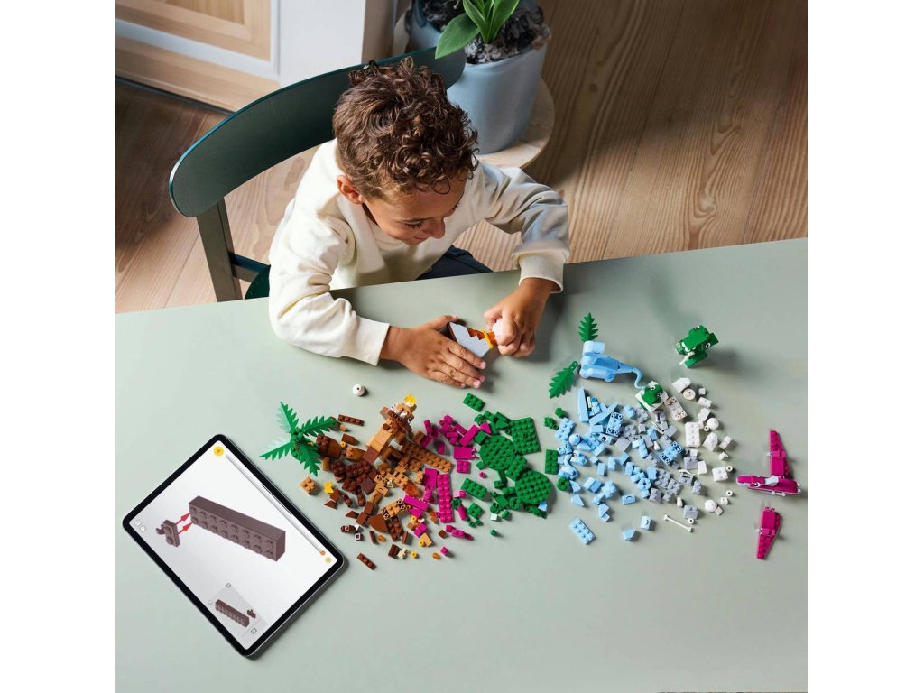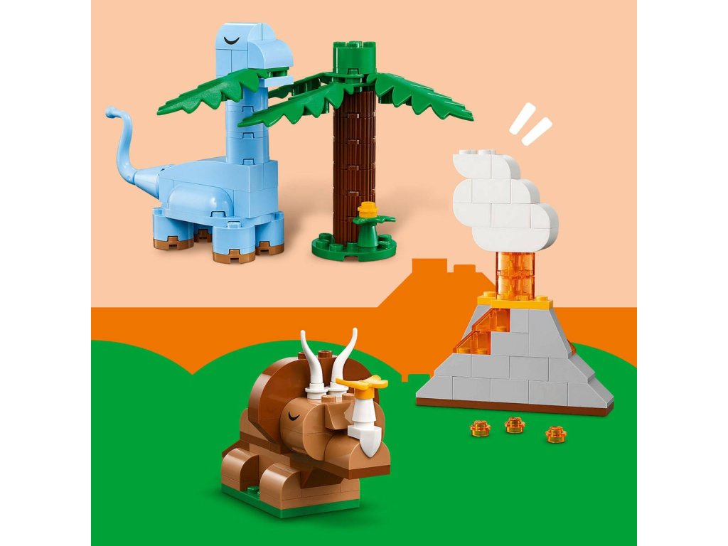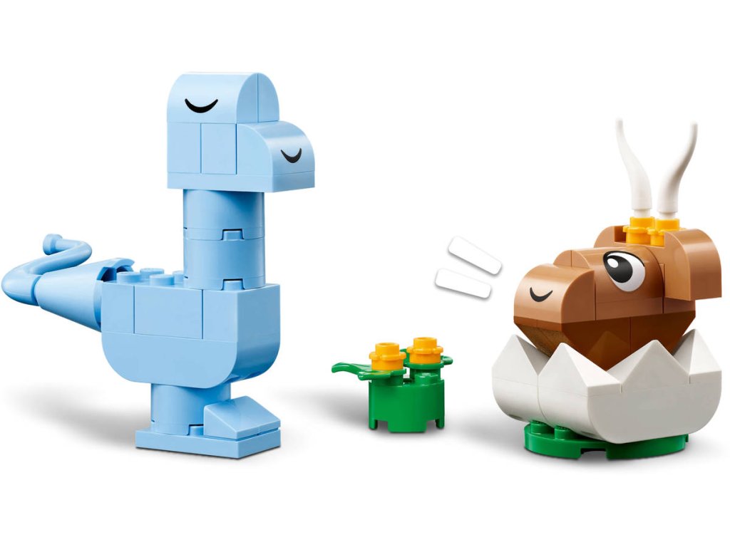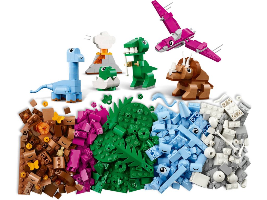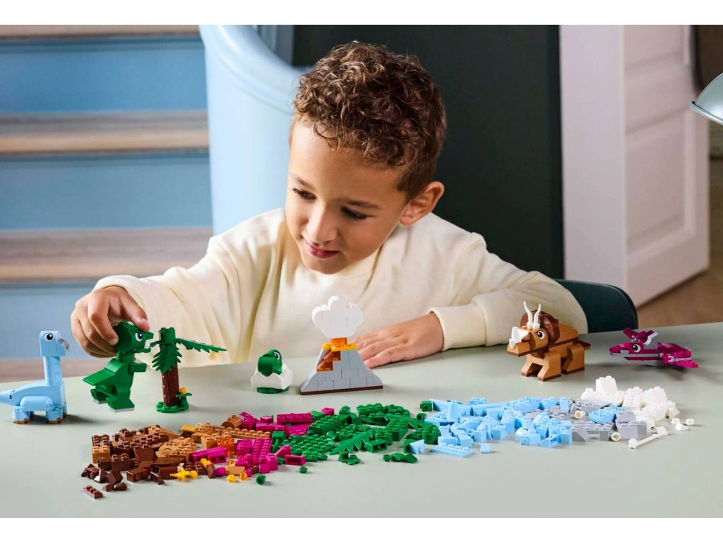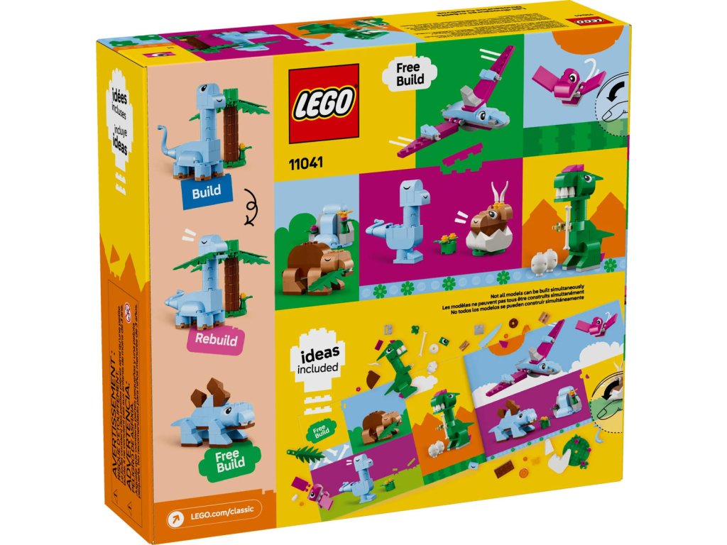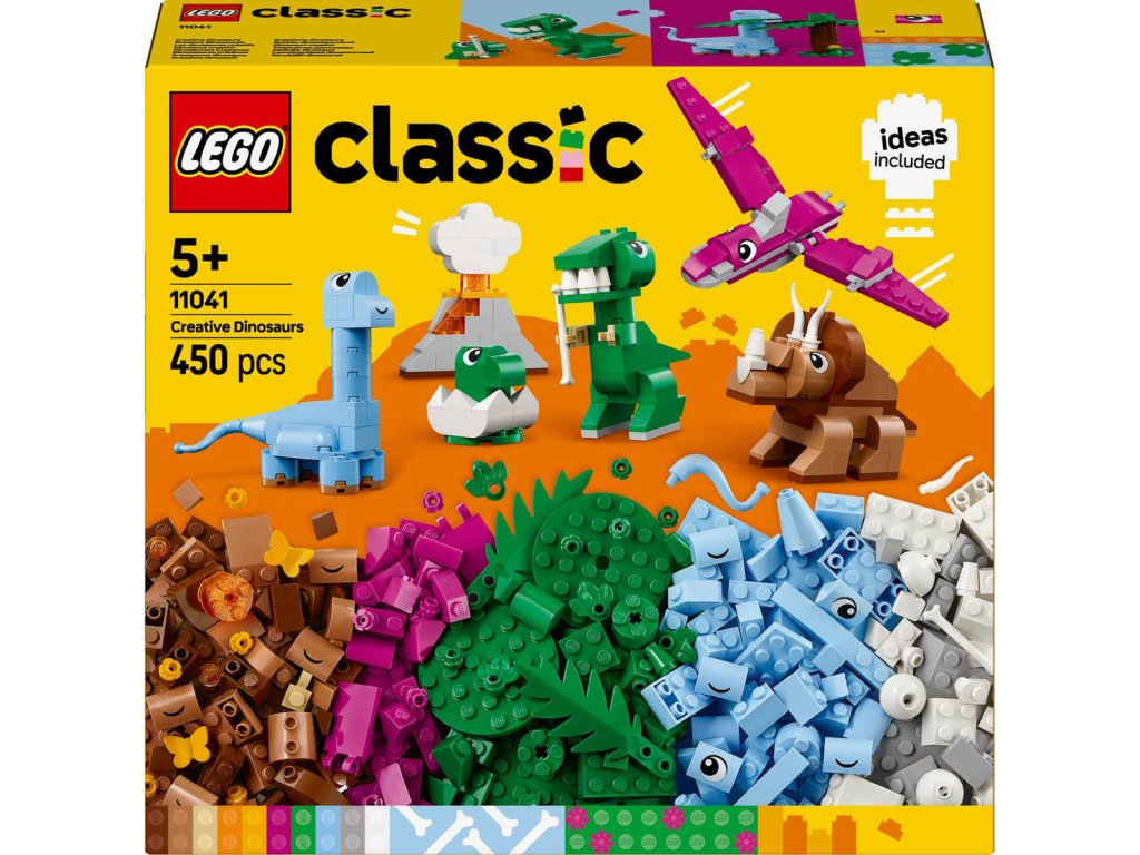 LEGO 11041 - Kreativní dinosauři z produktové řady LEGO CLASSIC - Dětská plastová stavebnice v krabici.Kreativní dinosauři je stavebnice s figurkami dinosaurů z kostek v modré, zelené, fialové a hnědé barvě. Tato neuvěřitelně všestranná stavebnice pro děti představuje skvělou hračku pro rozvoj kreativních stavitelských dovedností u dětí od 5 let, které milují dinosaury. Tato stavebnice plná rychle sestavitelných modelů dinosaurů LEGO obsahuje T-rexe, ptakoještěra, triceratopse, brontosaura a mládě T-rexe ve vejci. Součástí stavebnice je také sopka, palma a doplňky, které děti inspirují k hraní. Kromě barevných kostek stavebnice obsahuje také speciální dílky, včetně očí a úst, které dinosauřím tvářím dodají různé výrazy obličeje. Kreativní zábava bude pokračovat, když děti promíchají kostky a modely přestaví. Až děti získají větší sebevědomí při stavění, mohou podle intuitivního návodu na stavění vytvářet vlastní nápadité dinosaury.