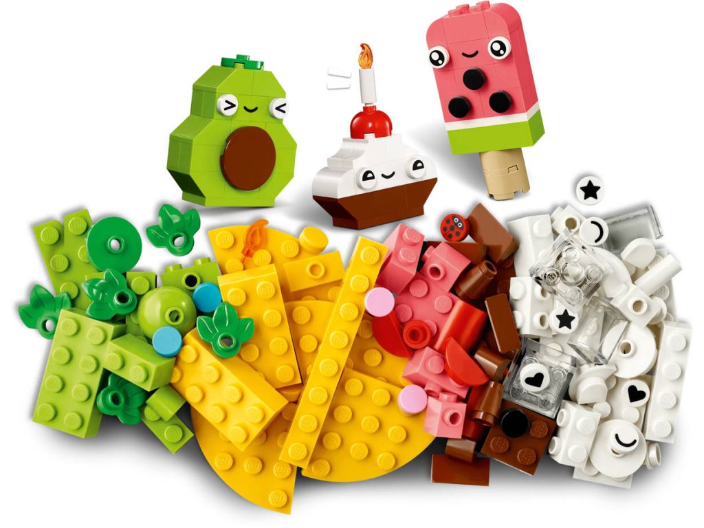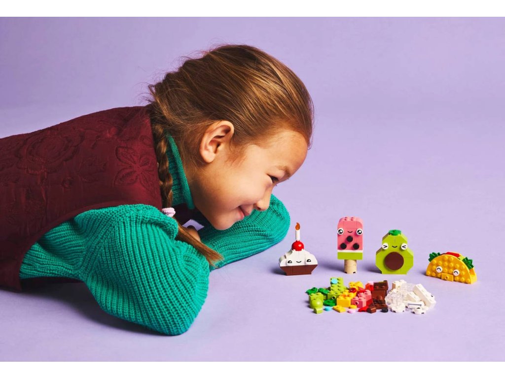 LEGO 11039 - Kreativní jídlo z produktové řady LEGO CLASSIC - Dětská plastová stavebnice v krabici.Všestranná stavebnice Kreativní jídlo je ideální pro děti od 4 let. S touto nápaditou hračkou si děti postaví řadu zábavných postaviček z jídla a užijí si celé hodiny hraní. Díky nekonečným možnostem zábavného stavění, přestavování a objevování tato stavebnice LEGO pro začínající stavitele pomáhá rozvíjet sebevědomí, soustředění a schopnost řešit problémy. Děti si pomocí pestrobarevných a poutavých kostek a speciálních dílků, jako jsou oči, ústa a řada dekorativních prvků, postaví 4 roztomilé hračky ze stavebnice Kreativní jídlo: Cupcake, zmrzlinu, avokádo a taco. Kreativní zábava bude pokračovat, když děti kostky promíchají a přestaví modely na dort s posypem, bubble tea, hrušku a panini. Až děti získají větší sebevědomí při stavění, mohou podle intuitivního návodu na stavění měnit jejich výrazy, tvary nebo barvy a poskládat si nové kamarády: Zelenou zmrzlinu, krabici džusu, kousek melounu, čokoládovou tyčinku a mega sendvič.