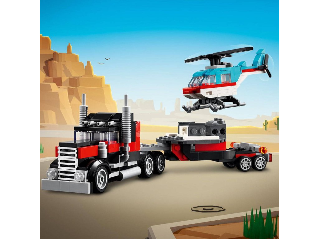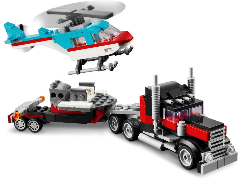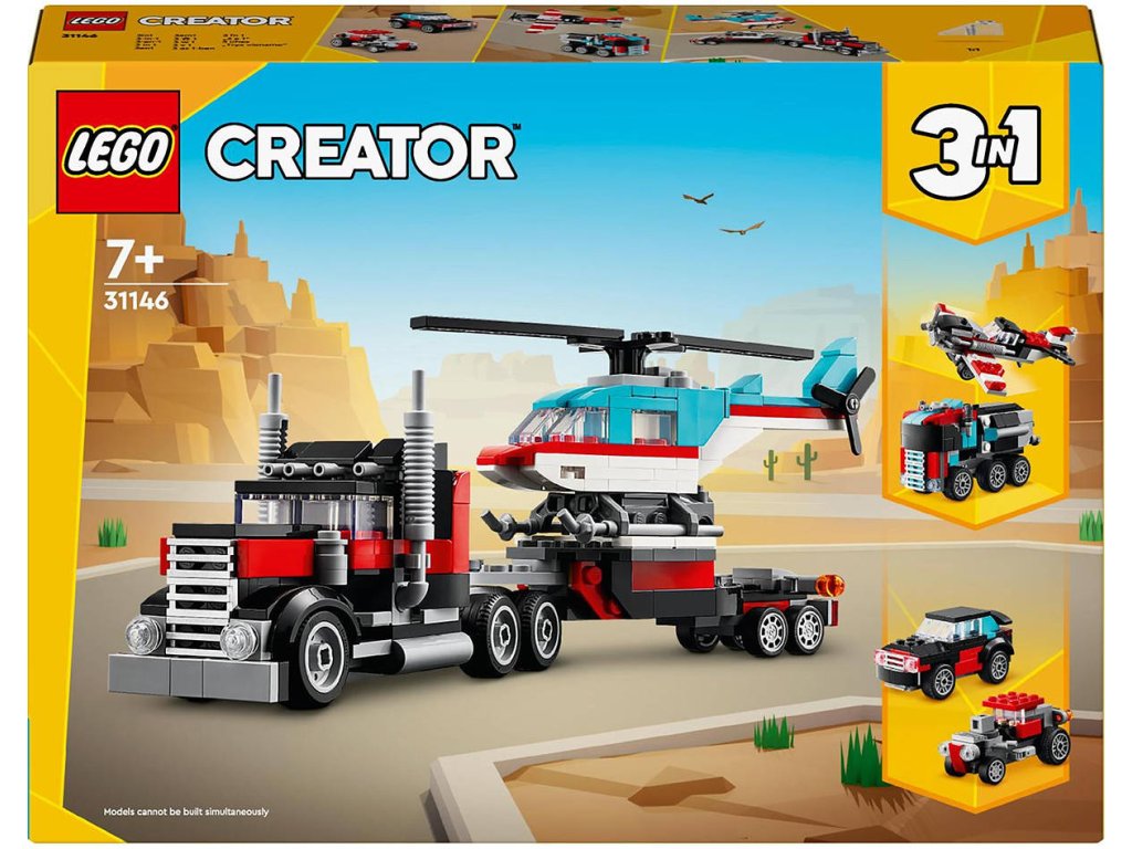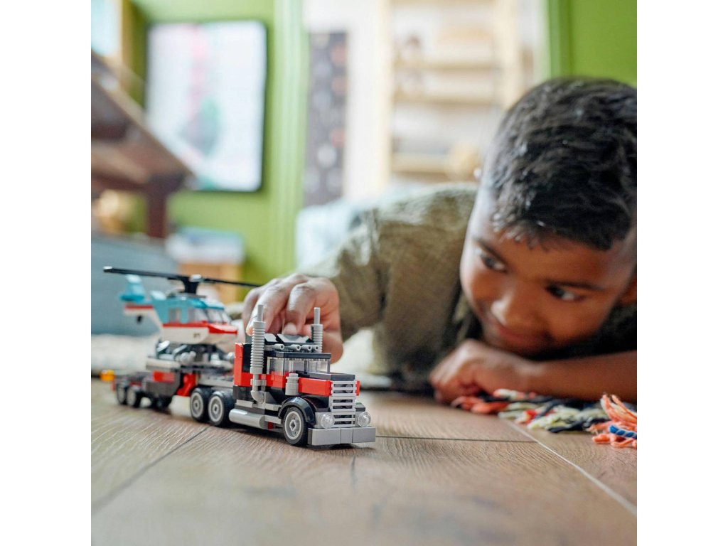LEGO 31146 - Náklaďák s plochou korbou a helikoptéra z produktové řady LEGO CREATOR - Dětské plastové kostky v krabici. 3in1.Děti od 7 let se se stavebnicí Náklaďák s plochou korbou a helikoptéra pustí do akčního hraní. Sada se skládá z 270 dílků, ze kterých si malí stavitelé postaví parádní náklaďák s otáčecími koly a korbou, na které přistane helikoptéra LEGO s pohyblivou vrtulí. Malí stavitelé si s touto stavebnicí z řady LEGO Creator 3 v 1 poskládají hned 3 různé dvojice modelů. Nejprve si postaví třeba náklaďák s plochou korbou a helikoptéru, pak modely přestaví na vrtulové letadlo a náklaďák s palivem s otáčecími koly a pak se vydají na závody s modely hot rodu a SUV – nebo si postaví vlastní originální vozidla.