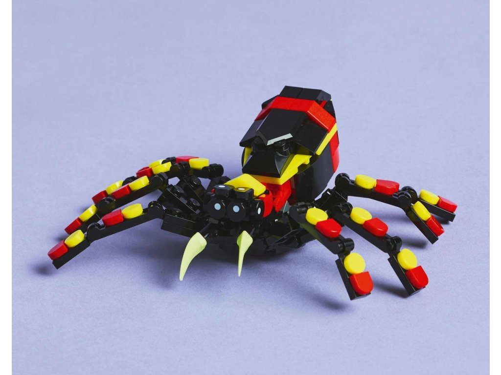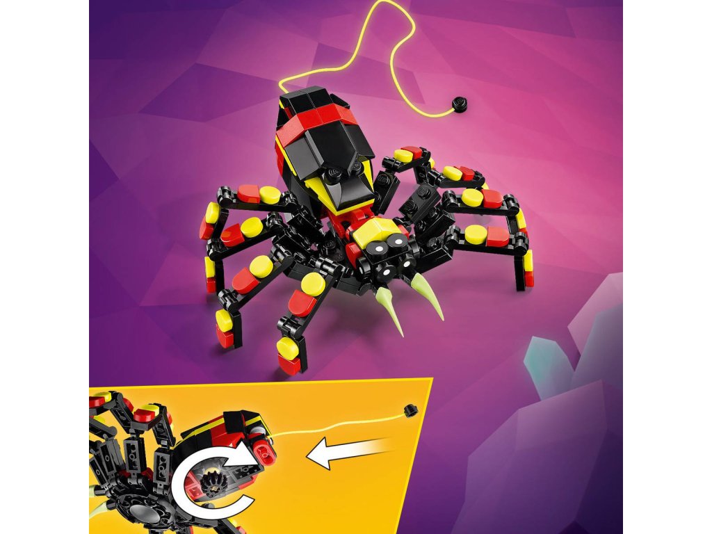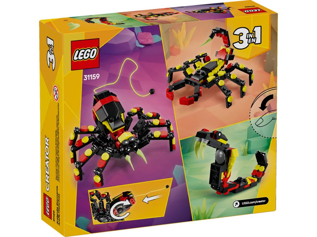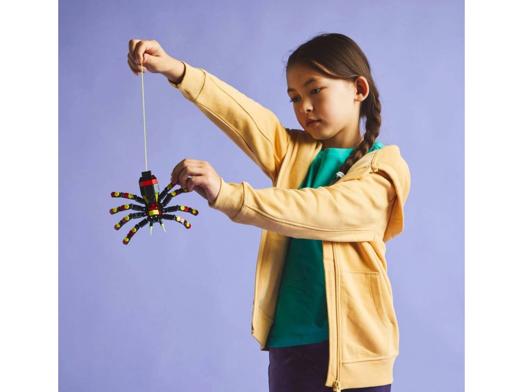 LEGO 31159 - Divoká zvířata: Překvapivý pavouk z produktové řady LEGO CREATOR - Dětská plastová stavebnice v krabici. 3in1.Kluci a holky od 7 let objeví fascinující živočichy se stavebnicí Divoká zvířata: Překvapivý pavouk. Barevný pavouk má 8 pohyblivých nohou a velké zuby a děti z jeho zad můžou vytáhnout neonově žlutou pavučinu, kterou pověsí na kostku LEGO a užijí si s ní kreativní hraní – nebo si model hrdě vystaví. Milovníky zajímavých zvířat čekají hned 3 různé možnosti stavění ze stejného balení kostek: pohyblivý pavouk LEGO s prodloužitelnou pavučinou, pohyblivá figurka škorpiona nebo majestátní pohyblivý had. Všechny 3 figurky zvířátek v této stavebnici na přestavování představují kreativní a zábavné dárky pro děti.