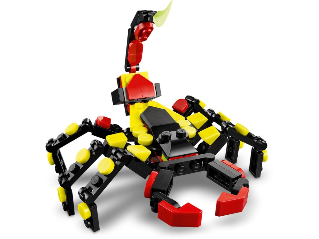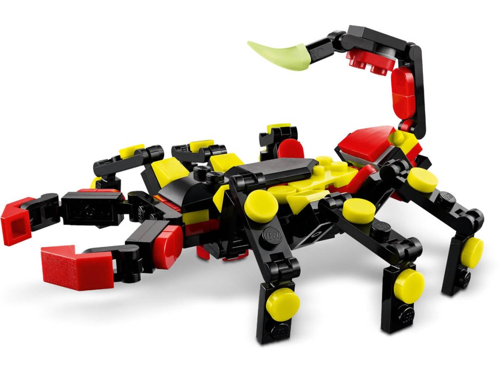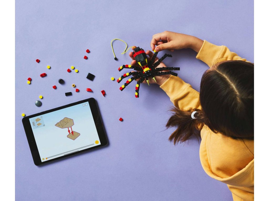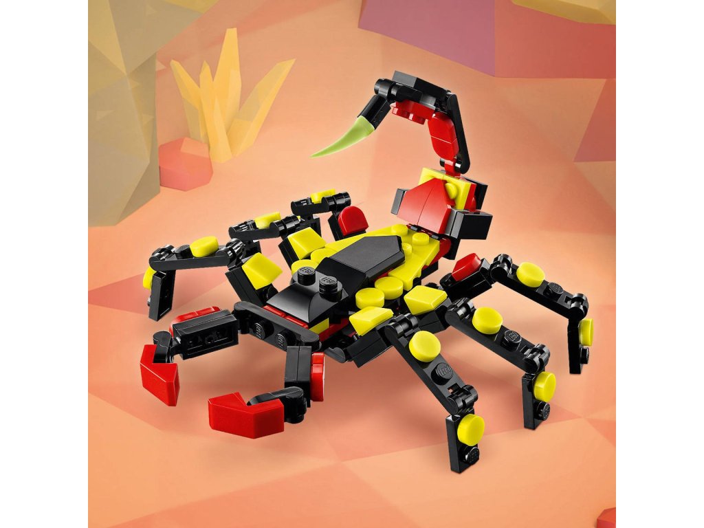 LEGO 31159 - Divoká zvířata: Překvapivý pavouk z produktové řady LEGO CREATOR - Dětská plastová stavebnice v krabici. 3in1.Kluci a holky od 7 let objeví fascinující živočichy se stavebnicí Divoká zvířata: Překvapivý pavouk. Barevný pavouk má 8 pohyblivých nohou a velké zuby a děti z jeho zad můžou vytáhnout neonově žlutou pavučinu, kterou pověsí na kostku LEGO a užijí si s ní kreativní hraní – nebo si model hrdě vystaví. Milovníky zajímavých zvířat čekají hned 3 různé možnosti stavění ze stejného balení kostek: pohyblivý pavouk LEGO s prodloužitelnou pavučinou, pohyblivá figurka škorpiona nebo majestátní pohyblivý had. Všechny 3 figurky zvířátek v této stavebnici na přestavování představují kreativní a zábavné dárky pro děti.