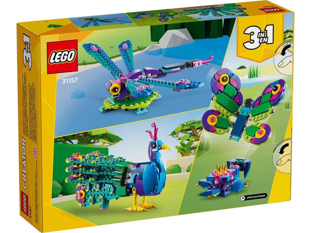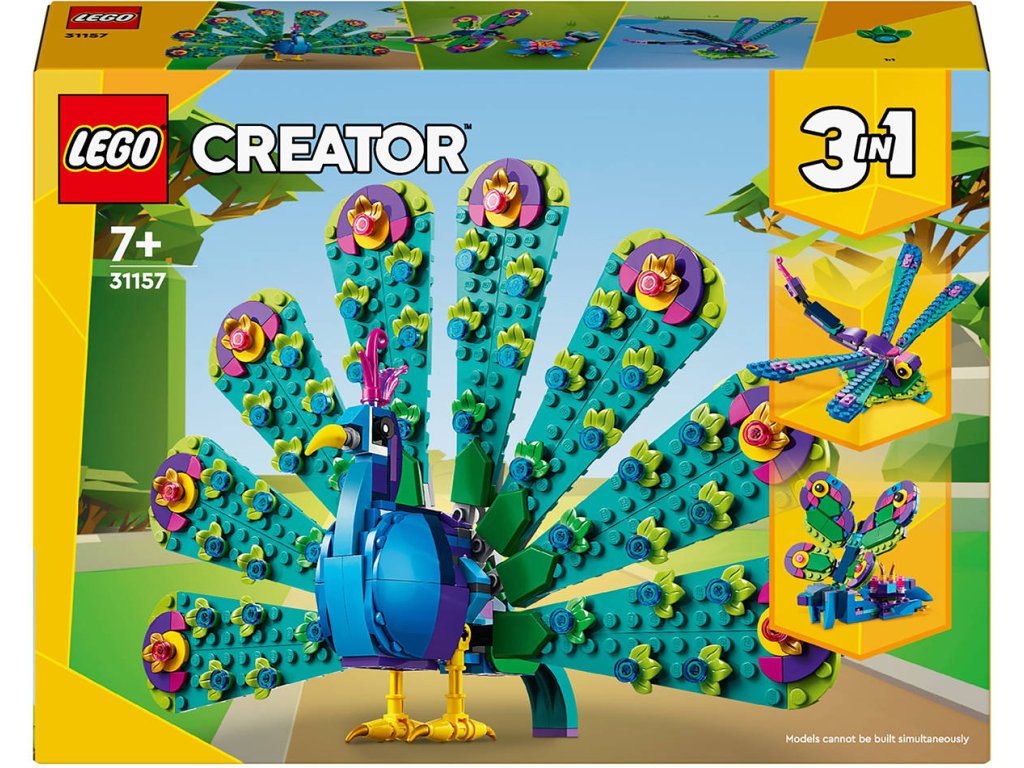 LEGO 31157 - Exotický páv z produktové řady LEGO CREATOR - Kvalitní dětská plastová stavebnice (3in1).S úchvatnou stavebnicí Exotický páv se děti od 7 let mohou těšit na dobrodružství se 3 exotickými zvířaty. Součástí je páv s nádhernými propracovanými pery, které můžete složit nebo hrdě rozvinout. Tato stavebnice LEGO Creator 3 v 1 nabízí trojnásobnou zábavu při stavění. Z jediné sady kostek postavíte figurku páva, kterou pak přestavíte na vážku s pohyblivými křídly a ocasem na podložce v podobě leknínu, nebo na barevného motýla s pohyblivými křídly. Každá ze 3 stavebnic se bude nádherně vyjímat na polici nebo na nočním stolku.
