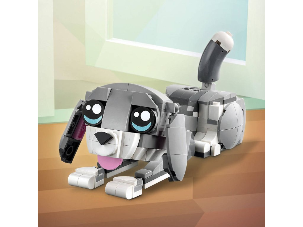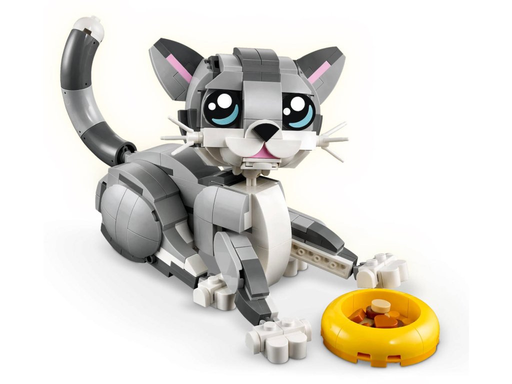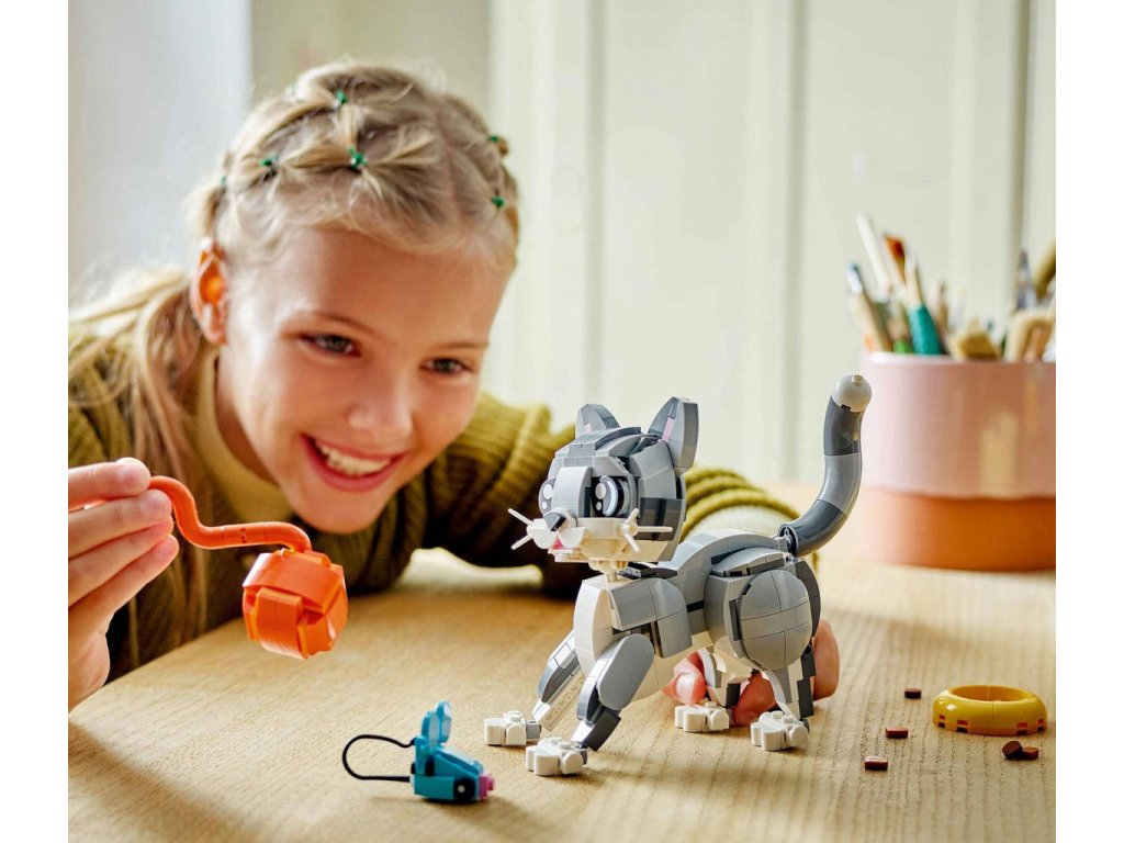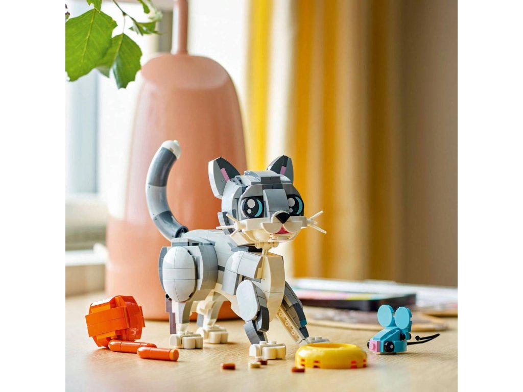 LEGO 31163 - Hravá kočička z produktové řady LEGO CREATOR - Dětská plastová stavebnice v krabici. 3in1.Potěšte milovníky domácích mazlíčků od 8 let rozkošnou stavebnicí Hravá kočka. S touto stavebnicí domácích mazlíčků si postavíte roztomilou kočku s pohyblivou hlavou, ušima, ocasem a nohama a doplňky, včetně misky na krmení, myši a klubíčka, a děti se s ní můžou hrát na zábavné příběhy. Holky a kluci si s touto stavebnicí LEGO postaví hned 3 různé modely zvířátek ze stejných kostek: pohyblivou kočku, která může sedět, stát a skákat, pohyblivého roztomilého pejska s kostí a model holuba s drobky. Díky těmto 3 modelům se jedná o skvělý dárek LEGO, který si děti můžou vystavit a užít si s ním nápadité hraní.