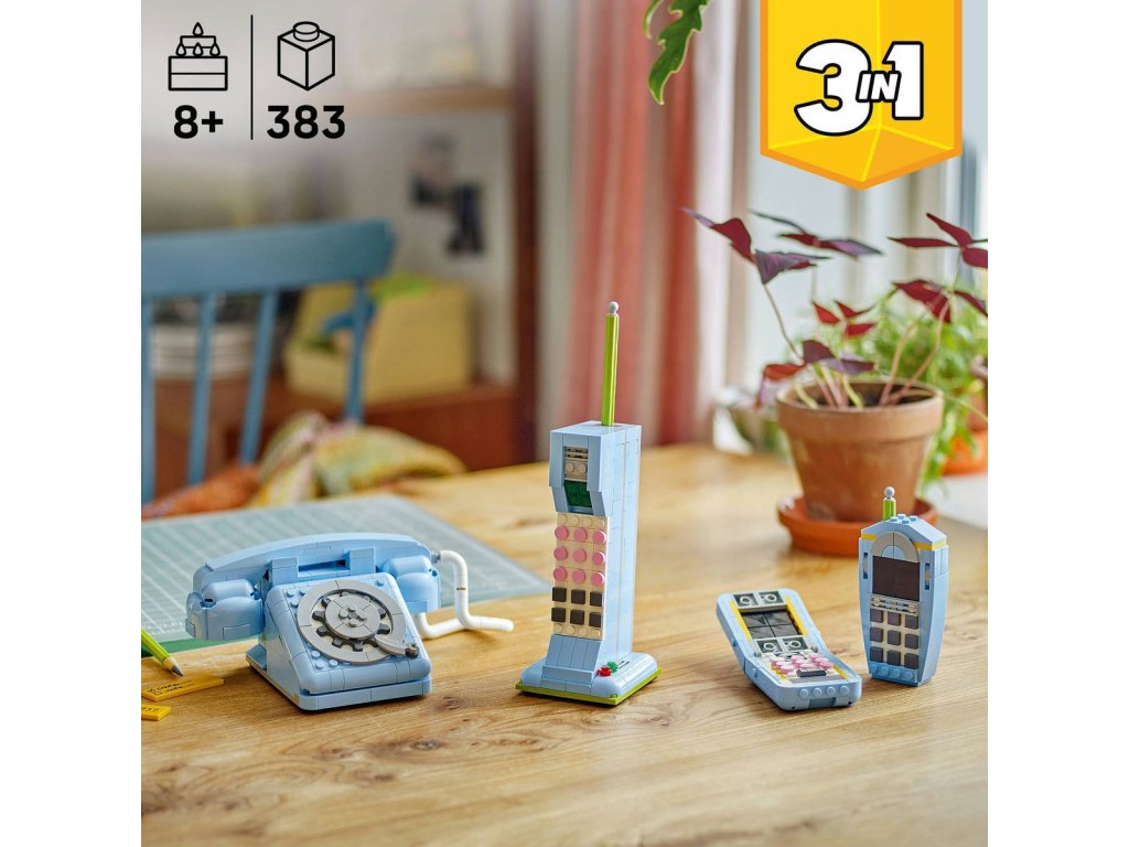 LEGO 31174 - Retro telefon z produktové řady LEGO CREATOR - Kvalitní dětská plastová stavebnice v krabici 3in1.Dospělí a kreativní děti od 8 let se vrátí v čase se stylovou nostalgickou stavebnicí Retro telefon. Model obsahuje parádní retro model telefonu z 60. let se zvedacím sluchátkem, flexibilním kabelem, rotační číselnicí afunkcí pružiny, která se aktivuje při zavěšení. Součástí retro stavebnice je také tužka z kostek a přizpůsobitelný samolepicí poznámkový blok se 3 dílky s různými vzkazy. Tato působivá stavebnice LEGO nabízí hned 3 různé možnosti stavění ze stejné sady kostek: retro telefon z 60. let, telefon z 80. let na nabíjecí základně nebo 2 parádní telefony ze začátku tisíciletí. Stavebnice LEGO Creator 3 v 1 představují skvělé dárky pro děti díky 3 různým možnostem sestavení v každé krabici. S přestavitelnými stavebnicemi 3 v 1 si děti užijí hodiny tvořivého hraní a každý stavitel si přijde na své. Všechny modely z této stavebnice nelze sestavit současně. Stavebnice obsahuje 383 dílků.