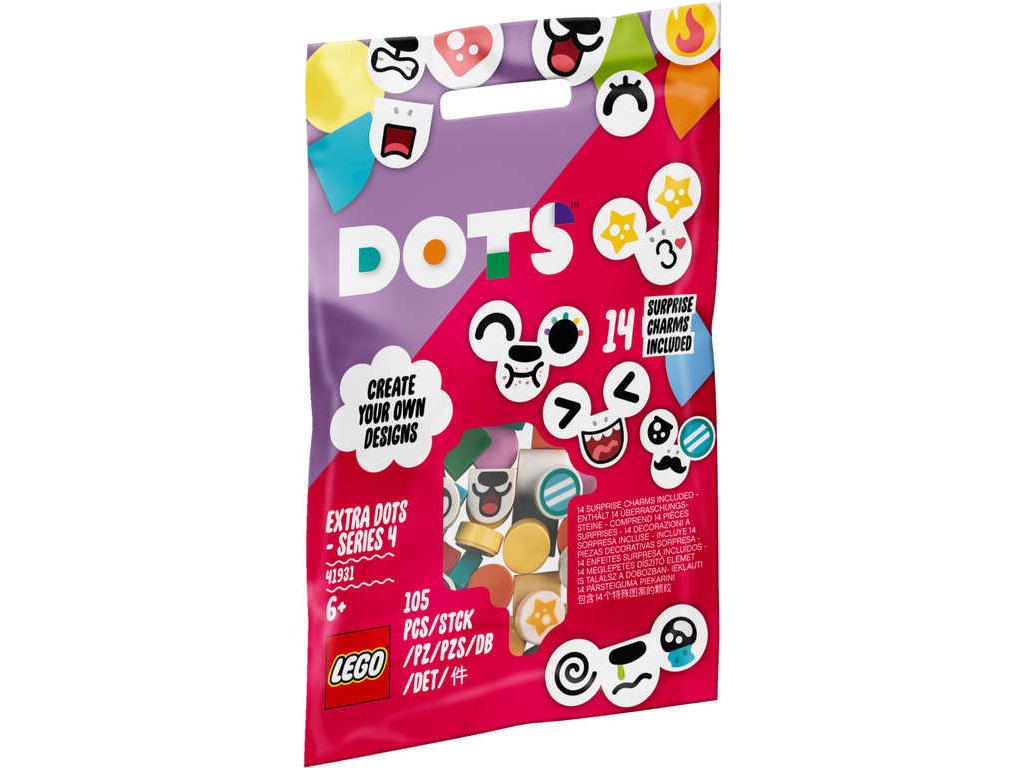 LEGO 41931 - Doplňky ke stavebnicím z produktové řady LEGO DOTS v sáčku.Děti a fanoušci umění a ručních prací si zamilují tajemnou sadu DOTS doplňky – 4. série (41931)! Dílky lze kombinovat s ostatními sety z řady LEGO® DOTS. Zdobítka dětem umožňují rozšiřovat jejich designy a