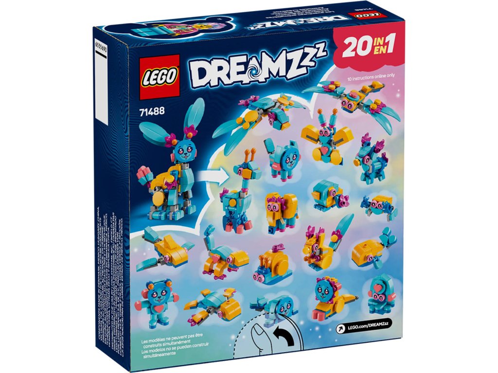 LEGO 71488 - Bunchu a kreativní zvířecí dobrodružství z produktové řady LEGO DREAMZZZ - Dětská plastová stavebnice v krabici. 20in1.Dopřejte dětem tvořivé hraní se stavebnicí Bunchu a kreativní zvířecí dobrodružství pro holky a kluky. Tato úžasná stavebnice s králíčkem je plná herního potenciálu a umožňuje malým snílkům od 7 let objevit 20 krásných způsobů, jak přestavit králíčka Bunchu. Děti si užijí hodiny kreativity při stavění roztomilé figurky králíčka Bunchu s pohyblivýma nohama, rukama, tlapkami, ocasem a ušima, kterou pak přestaví na některý z 19 modelů zvířátek. Mezi tyto možností patří lev, želva, jelen, motýl, vážka a spousta dalších! Tuto fantasy stavebnici se zvířátky oživí minifigurka Izzie v novém oblečení s plyšákem v ruce. Děti se můžou těšit na nápadité hraní na postavy a vymýšlení nových dobrodružství s hrdinkou ze světa LEGO DREAMZzz a jejím králíčkem.