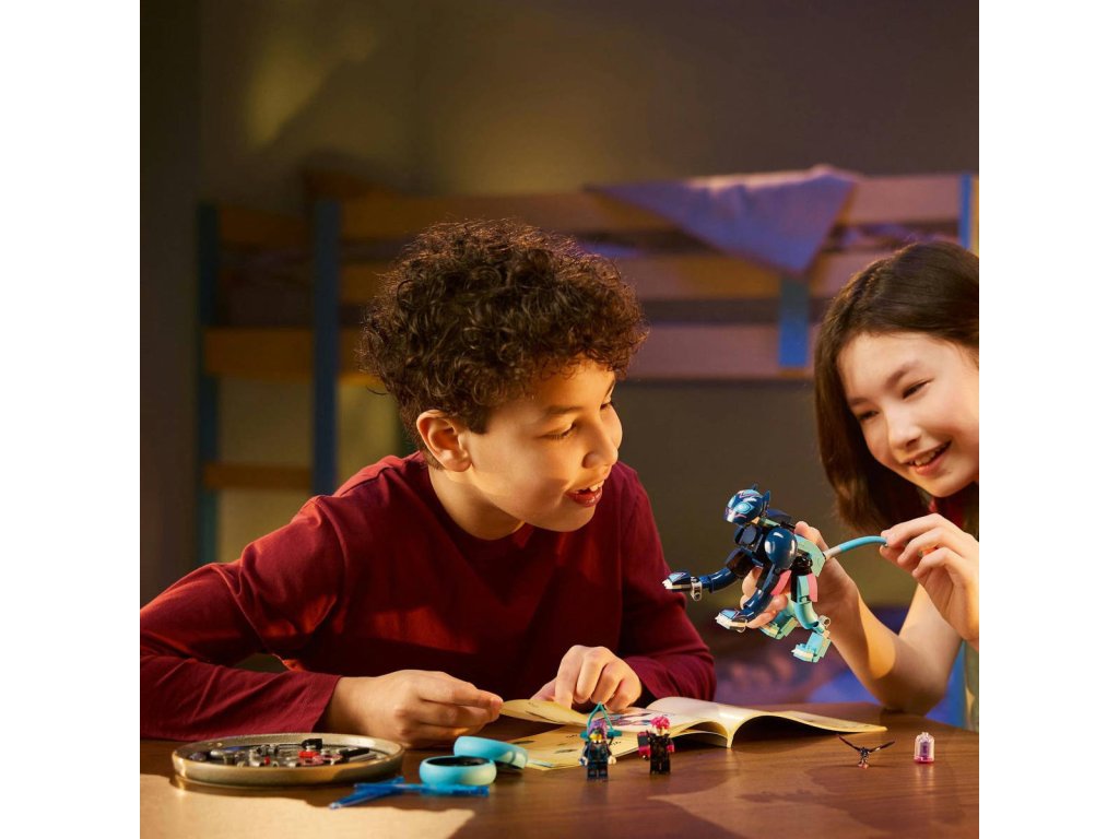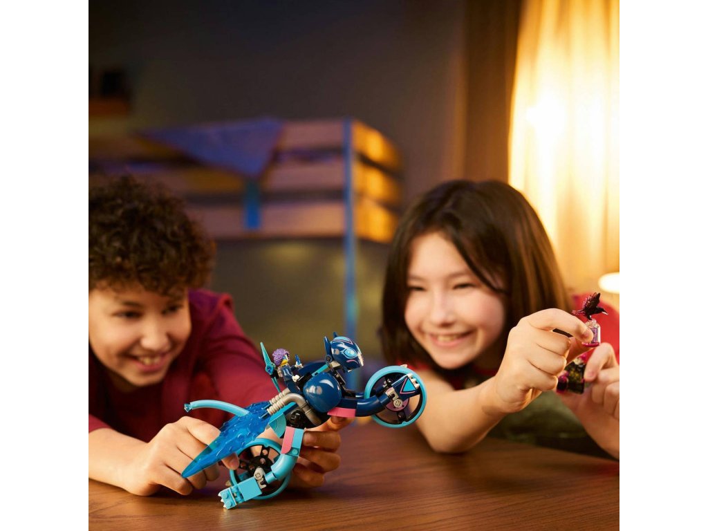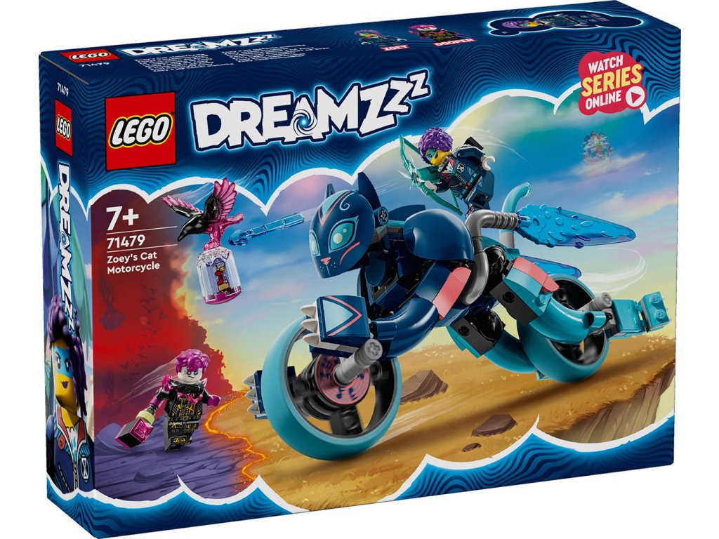 LEGO 71479 - Zoey a její kočičí motorka z produktové řady LEGO DREAMZZZ - Kvalitní dětská plastová stavebnice v krabici.Zažehněte jiskru dětské představivosti se stavebnicí Zoey a její kočičí motorka. Tato přestavitelná kočka pro děti je inspirovaná napínavým televizním seriálem a kluci a holky od 7 let se s ní vydají do Světa snů s parádnímvozidlem z kostek LEGO. Krkavec Nikdyčarodějnice ukradl vzpomínku! Děti se spojí se Zoey a pomůžou jí vzpomínku získat zpět! Malí stavitelé si vyberou ze 2 možností sestavení – postaví pohyblivou figurku kočky, kterou pak promění na úžasnou kočičí moto rku s koly nebo na rychlou kočku s turbo posilovači. Kočičí motorka pronásleduje krkavce a kočka s ním bojuje. Tato stavebnice LEGO DREAMZzz zažehne jiskru dětské představivosti a ožívá díky 2 minifigurkám, včetně Zoey, kterou lze připevnit na zadní stranu modelu kočky, a mezi jejími doplňky najdete střílející luk. Nechybí také návod na stavění vedený příběhem, díky kterému se děti stanou hrdiny Světa snů, prožijí 2 dobrodružství a vychutnají si ještě nápaditější hraní s kreativní hračkou s kočičí tematikou.