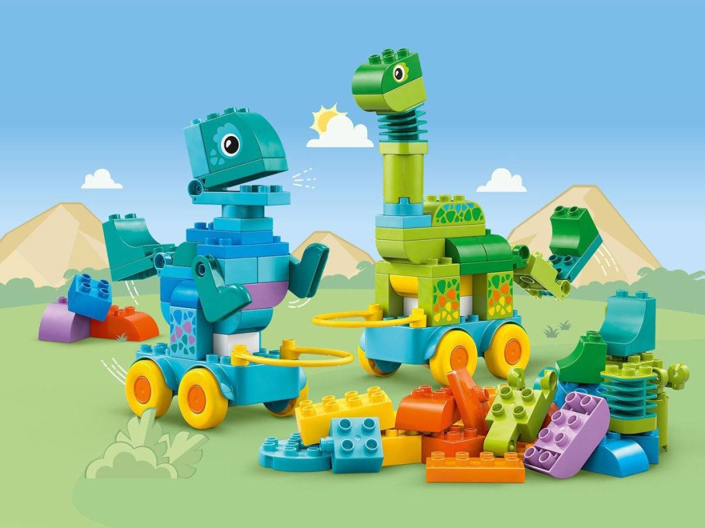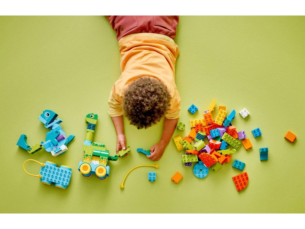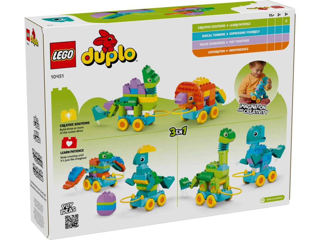 LEGO 10451 - Dinosauři na kolečkách z produktové řady LEGO DUPLO - Kvalitní dětská plastová stavebnice v krabici. 3in1.Dopřejte malým stavitelům pořádnou porci zábavy se stavebnicí 3 v 1: Dinosauři na kolečkách. Tato dinosauří stavebnice je plná tvořivých herních možností a součástí je řada barevných kostek, ze kterých lze vytvořit 3 páry kreativních modelů. 108 kostek a dílků v této stavebnici LEGO DUPLO se zvířátky lze sestavit 3 různými způsoby: Diplodocus a T-rex, triceratops a stegosaurus nebo pteranodon a parasaurolophus. Děti si můžou vytvořit ještě zábavnější figurky přidáním pohyblivého krku a ocasu, křídel nebo tlamy, kterou lze otvírat a zavírat. Dinosaury lze umístit na podložku s kolečky, takže stavebnice potěší všechny malé milovníky vozidel LEGO DUPLO. Tato stavebnice LEGO DUPLO 3 v 1 nabízí spoustu příležitostí k hravému učení. Model se skládá z kostek, se kterými se snadno manipuluje. Stavebnice dětem pomůže rozvíjet trpělivost, soustředění a představivost při nekonečném stavění a přestavování kreativních zvířátek.