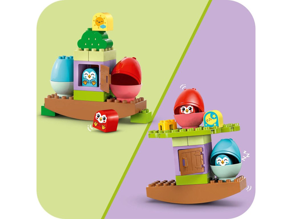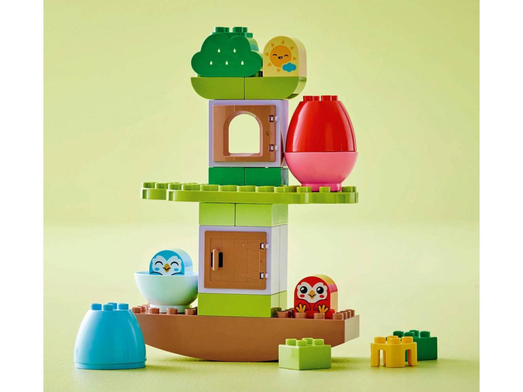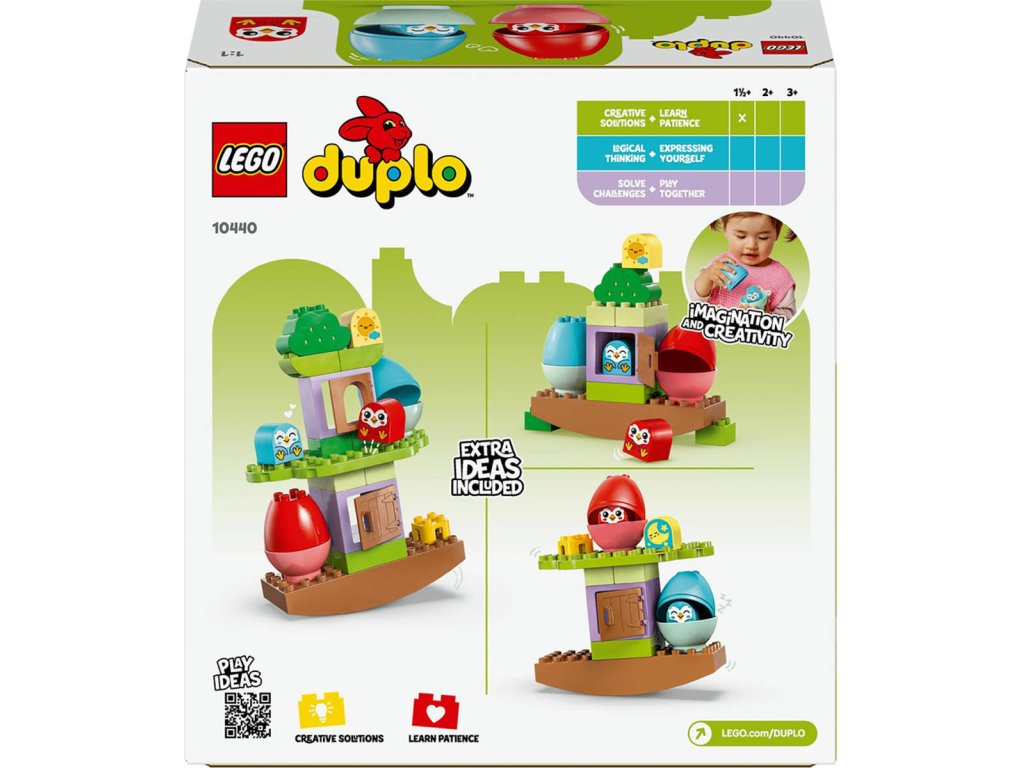 LEGO 10440 - Houpací a skládací strom z produktové řady LEGO DUPLO - Dětská plastová stavebnice v krabici.Vneste do hraní dynamickou zábavu plnou balancování se vzdělávací hračkou Houpací a skládací strom. Tato pestrobarevná stavebnice pro děti od 18 měsíců malým stavitelům přinese hodiny učení a zábavy v roztomilém domě na stromě se sovami. Tato stavebnice pro malé děti je navržena tak, aby pomáhala rozvíjet trpělivost a schopnost řešení problémů při vymýšlení způsobů, jak skládat dílky tak, aby byl strom vyvážený. Malí milovníci zvířat mohou přidat další kostky a strom upevnit nebo jednoduše prozkoumávat domek na stromě se sovími figurkami LEGO DUPLO. Dospělí s pomocí denní a noční kostky ukážou dětem, že tito ptáci jsou aktivní v noci, ale přes den spí ve vejcích. Malé děti procvičí své jemné motorické schopnosti při otevírání dotykových vajíček a schopnost třídit barvy při přiřazování sov k vejcím. Tuto hračku s motivem přírody lze přestavět mnoha různými způsoby, a děti tak zapojí i kreativitu a vytrvalost.