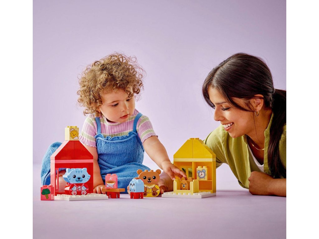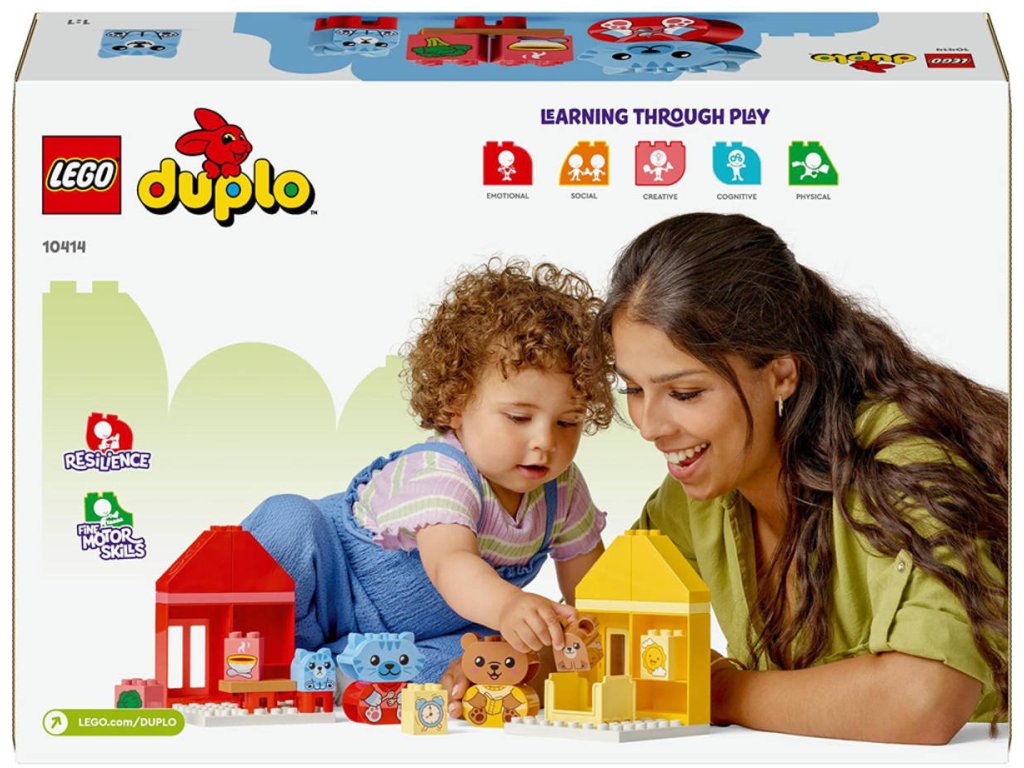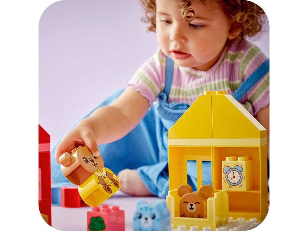 Stavebnice LEGO DUPLO představují skvělý způsob učení hrou. Zábavné interaktivní hraní příběhů a figurky rodičům umožní batolatům vysvětlit, co jsou každodenní aktivity a proč jsou tak důležité. Malé děti při stavění 2 domečků z barevných kostek prohloubí své jemné motorické schopnosti. Každá činnost má přiřazenou vlastní barvu, takže stavení je přímo hračka!