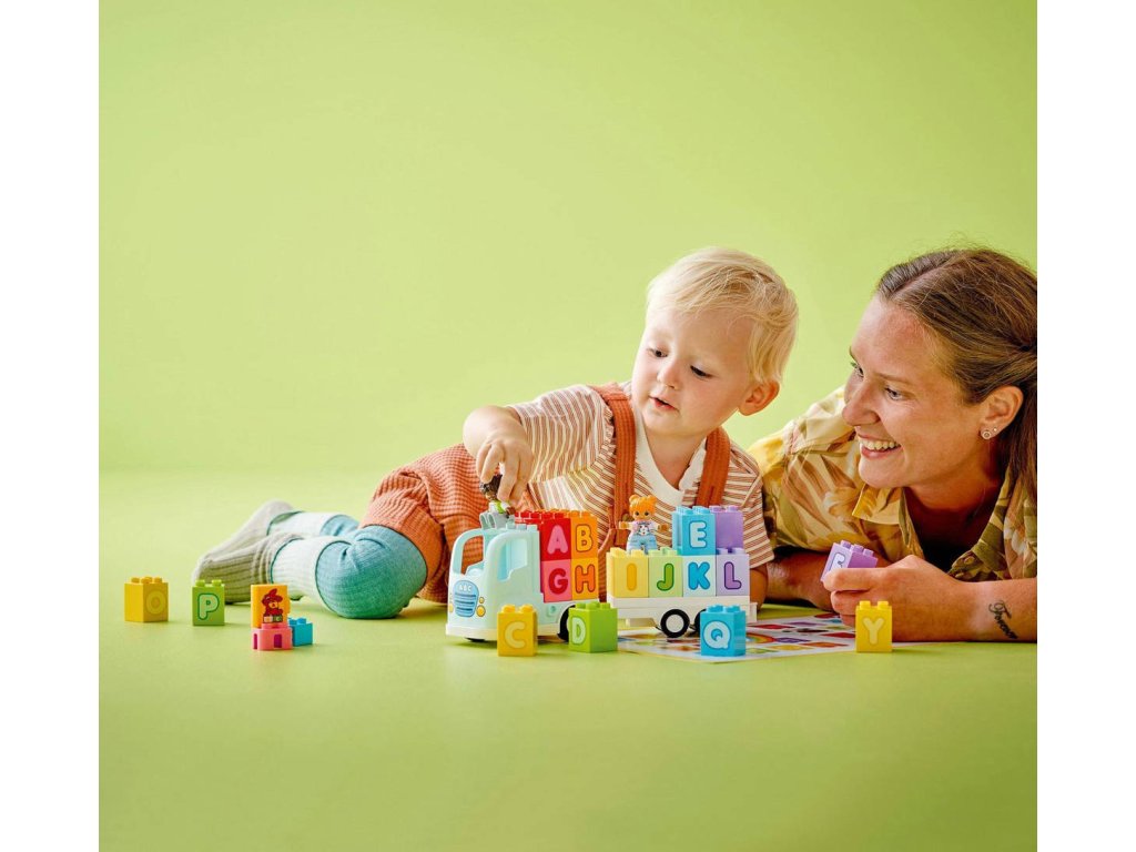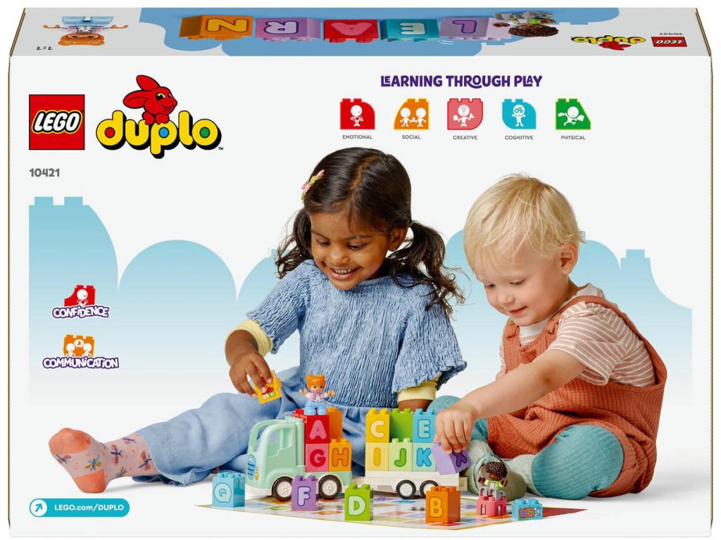 LEGO 10421 - Náklaďák s abecedou z produktové řady LEGO DUPLO - Dětské plastové kostky v krabici.Stavebnice Náklaďák s abecedou malým dětem pomůže naučit se poznávat písmenka. Tato kreativní hračka s abecedou přináší spoustu možností učení hrou. Malé děti si vyzkouší připojení přívěsu k náklaďáku, pomohou 2 figurkám LEGO DUPLO naskládat a vyskládat kostky a naučí se rozpoznávat písmena, barvy, zdokonalí mluvení a procvičí si jemné motorické schopnosti. Ve stavebnici LEGO DUPLO s písmenky na děti čeká řada nápaditých doplňků, včetně knížky a sterea, které malé stavitele povzbuzují k recitování abecedy společně s rodiči. Tato vzdělávací hračka inspiruje batolata k vymýšlení kreativních příběhů. Za volantem modelu náklaďáku čekají nápaditá dobrodružství!