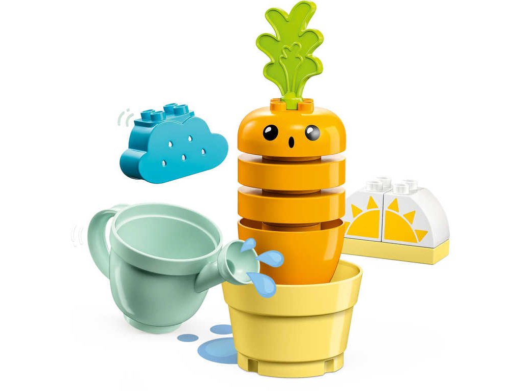 LEGO 10981 - Pěstování mrkve z produktové řady LEGO DUPLO. Dětské plastové kostky v krabici.Se vzdělávací stavebnicí Moje první pěstování mrkve se děti zábavným způsobem dozví o zdravém životním stylu a o tom, jak se pěstuje zelenina. Tato barevná stavebnice je navržena tak, aby nenásilně seznámila nejmenší děti od 18 měsíců se soběstačným životním stylem, zatímco budou skládat kostky na sebe, aby jejich mrkev rostla. Děti budou také ovládat počasí s pomocí kostek v podobě sluníčka a mráčku, aby poskytly rostlině to, co potřebuje. A aby jí opravdu nic nechybělo, mohou ji zalévat pomocí konve. Překvapený výraz mrkve prozrazuje, že voda musela být opravdu studená! Všechny modely LEGO DUPLO byly odborně navrženy tak, aby přinášely zábavné příběhy, pestré barvy, zajímavé postavy a spoustu detailů, které děti inspirují k nápaditému hraní a rozvíjení nových dovedností.
