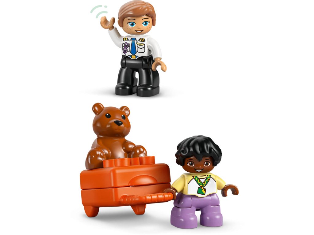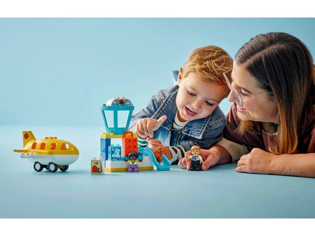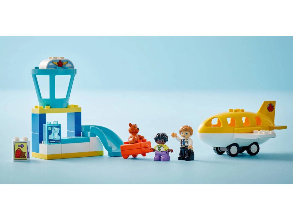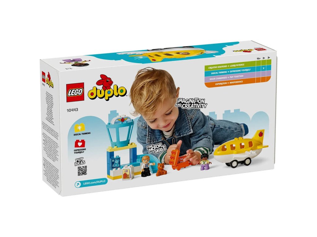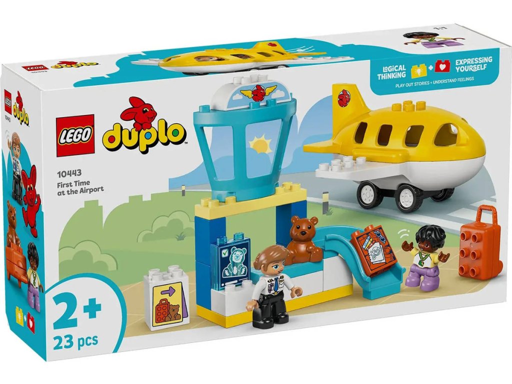 LEGO 10443 - Poprvé na letišti z produktové řady LEGO DUPLO - Kvalitní dětská plastová stavebnice v krabici.Pomozte batolatům budovat sebedůvěru při hře se stavebnicí Poprvé na letišti. S tímto dárkem si malé děti užijí hodiny tvořivého hraní, sbalí si kufr na výlet a připraví se na napínavou cestu. Tato stavebnice přináší spoustu funkcí, které děti inspirují ke kreativnímu hraní. Součástí je pult, u kterého si děti můžou hrát na skenování kufru a jeho posunování po pásu, věž řízení letového provozu a pohyblivé letadlo, do kterého se vejde figurka medvídka, dítěte a pilota. Tato hračka pro malé děti je plná vzdělávacích aktivit. Součástí je kolo emocí, které umožní celé rodině diskutovat o pocitech z cesty na rušné letiště nebo z cestování letadlem. Děti procvičí své jemné motorické schopnosti během balení otevíracího kufru a usazování figurek do letadla. Model navíc podporuje logické myšlení a inspiruje děti k tomu, aby zapojily kreativitu během cesty a staly se hrdiny vlastního dobrodružství LEGO DUPLO. Obsahuje 23 dílků.