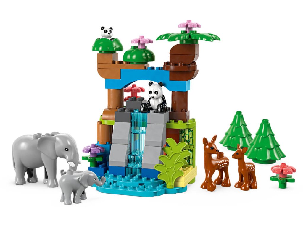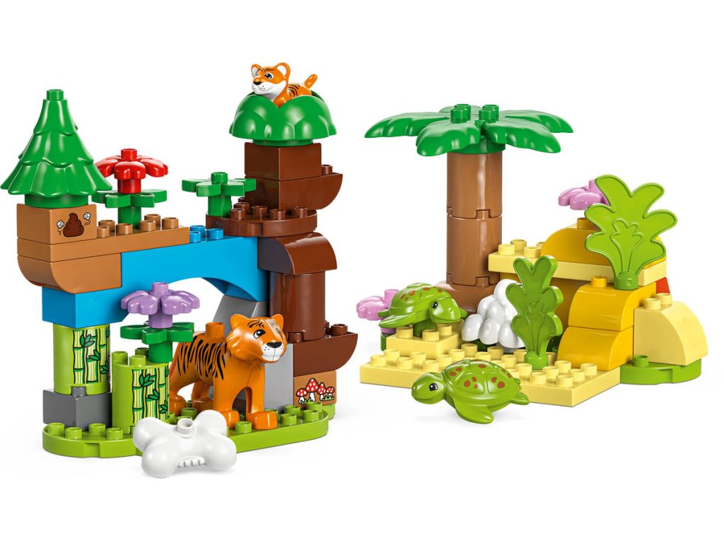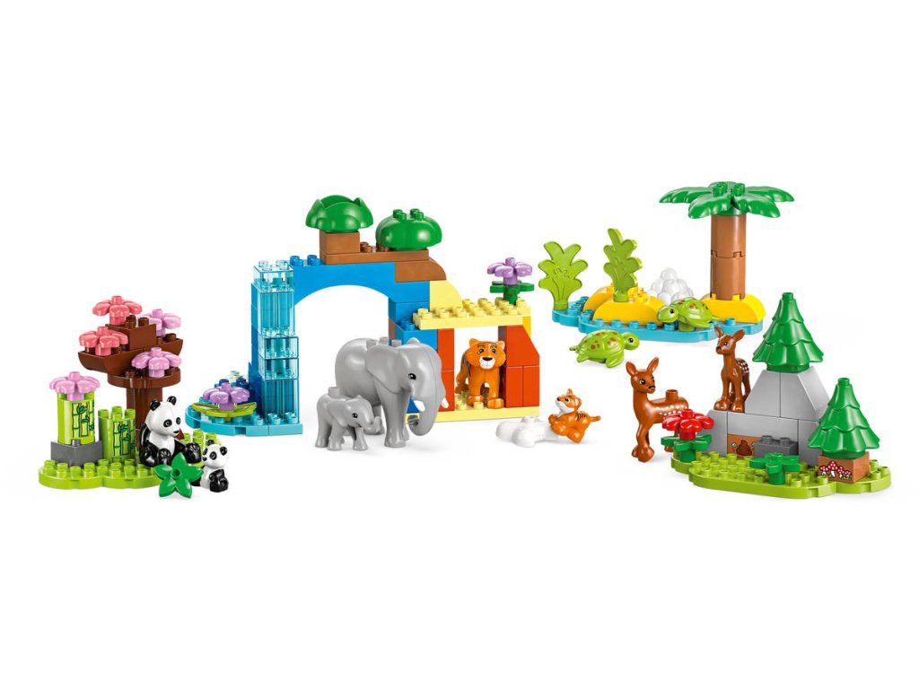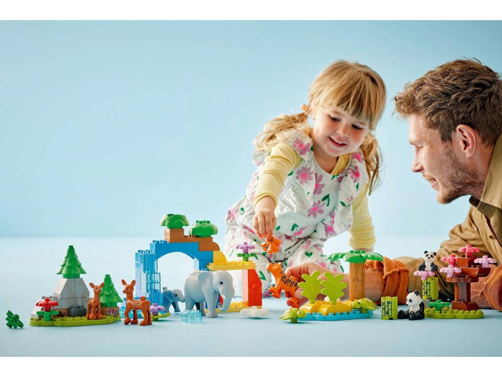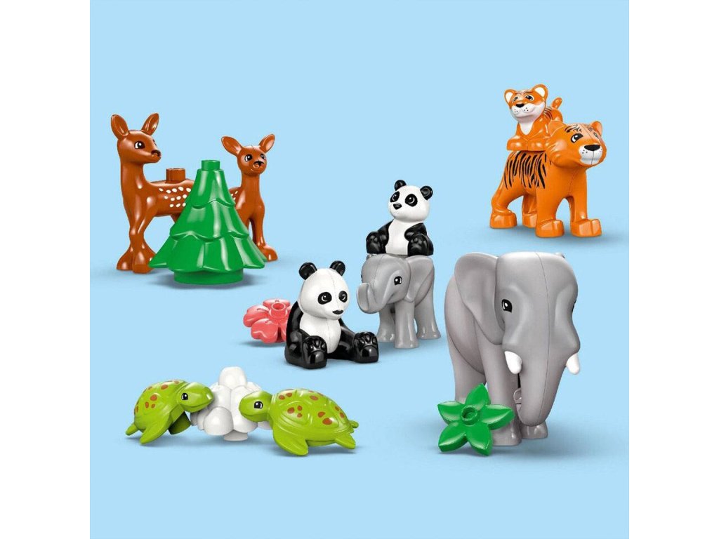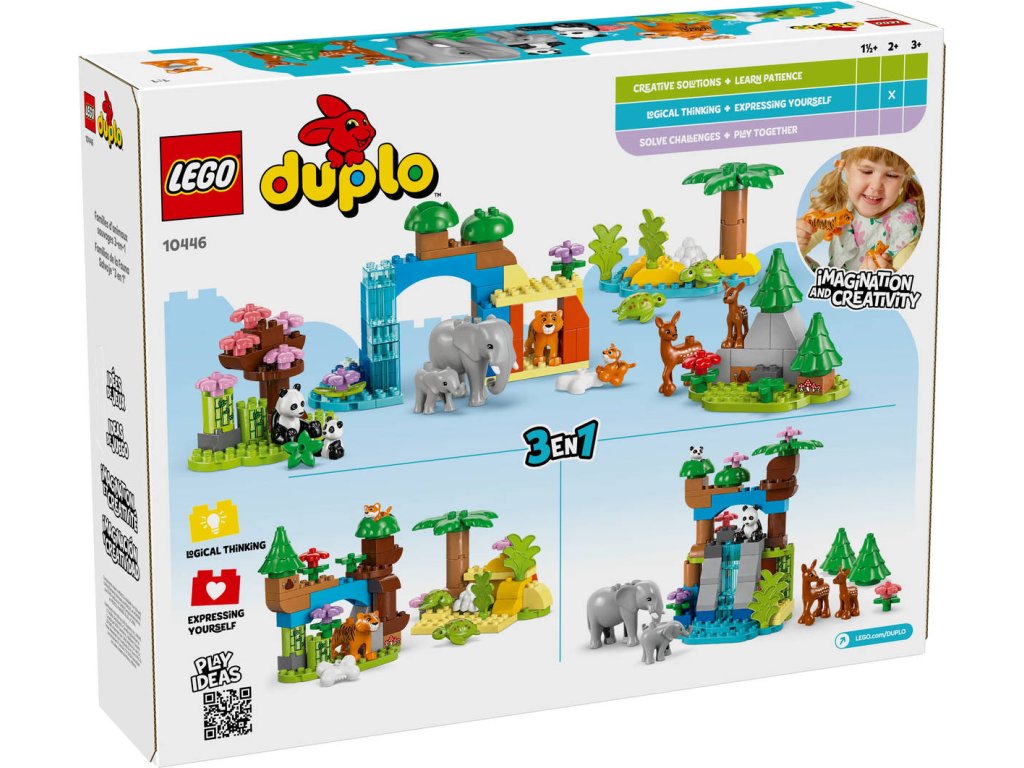 LEGO 10446 - Rodinky divokých zvířat z produktové řady LEGO DUPLO - Dětská plastová stavebnice v krabici. 3in1.Hledáte dárek pro malé milovníky zvířat? Děti se se stavebnicí Rodinky divokých zvířat 3 v 1 vydají na dobrodružnou cestu po celém světě. Tato naučná hračka je plná vzdělávacích prvků a obsahuje 10 figurek zvířátek LEGO DUPLO. Tato hračka pro malé děti zobrazuje scénu ze savany, kde si figurka tygřice a tygřího mláděte pochutnávají na kosti a poté si hrají na skalách. Figurka slona zase vede své mládě k vodopádu. Malé děti procvičují jemnou motoriku, když připínají slůně k ocasu dospělého slona. Na pláži kladou želvy vajíčka. V lese si figurka pandy a její mládě hrají pod rozkvetlou třešní a roztomilé figurky jelenů se pasou na mýtině. Malí milovníci hraček s motivem přírody si s touto stavebnicí procvičí celou řadu dovedností:Spárují a porovnají dospělá zvířata a jejich mláďata a rozhodnou o tom, jaké jídlo jednotlivá zvířátka jedí. Při přestavování této stavebnice LEGO DUPLO 3 v 1 pak zapojí kreativitu a představivost.