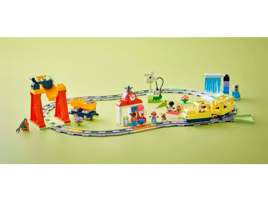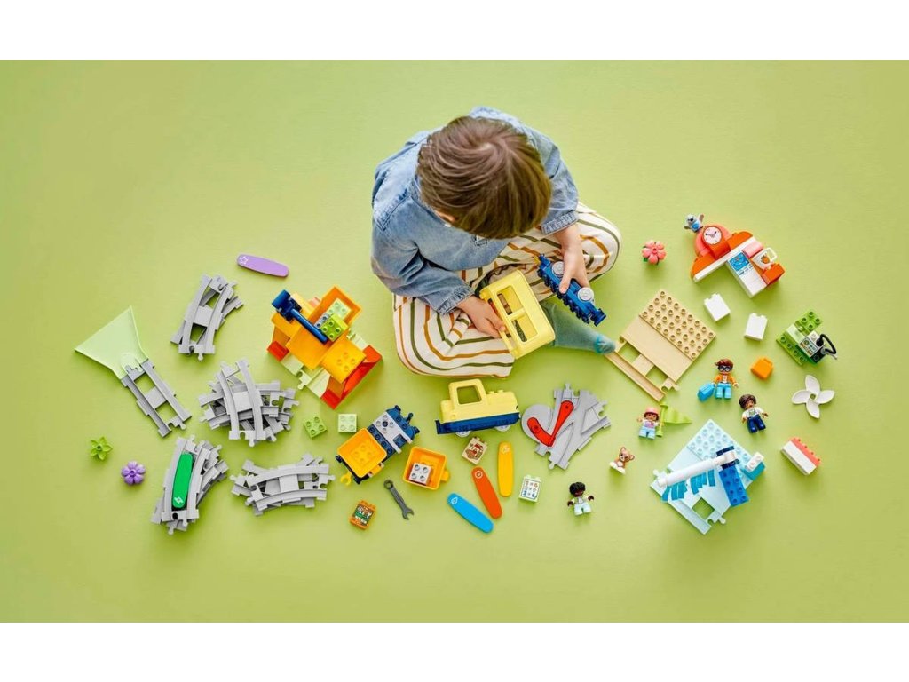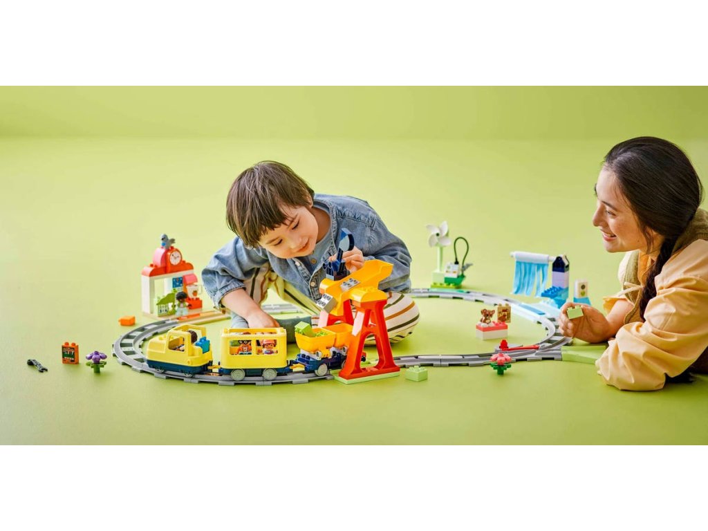 LEGO 10428 - Velký interaktivní komunitní vláček z produktové řady LEGO DUPLO - Kvalitní dětská plastová stavebnice. Hračka na baterie, se světlem a zvukem.Děti od 3 let se vydají na fantastickou cestu se sadou Velký interaktivní komunitní vláček. Tato akční stavebnice přináší spoustu funkcí a doplňků. Součástí jsou 4 různorodé figurky a děti se se stavebnicí mohou těšit na hodiny fascinujícího učení. esta malých badatelů za poznáním začíná na železniční stanici. Děti využijí kreativní myšlení a naplánují trasu osobního vláčku s technologií Push & Go. Během jízdy řeší zábavné úkoly – mohou na vlak naložit náklad, dobít motor nebo umýt vagony. Každá aktivita ožívá díky světlům a zvukům, které se aktivují, když vláček přejede přes jednu z 5 akčních kostek. Stavebnice také pomáhá dětem prohloubit trpělivost a zvídavost, když malí stavitelé přemýšlí nad novými způsoby sestavení železniční dráhy.