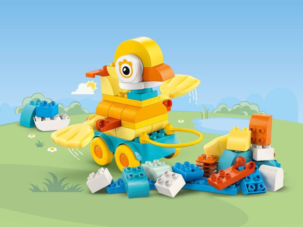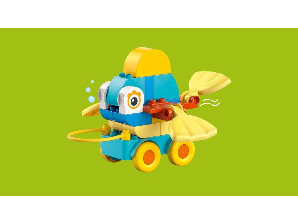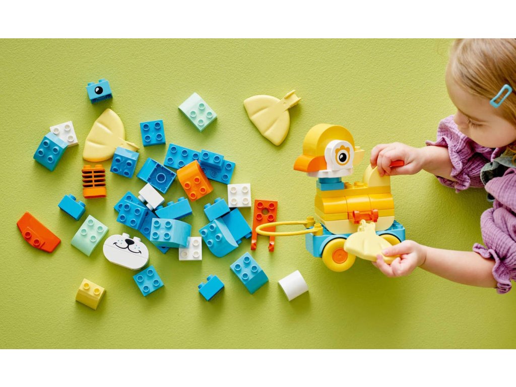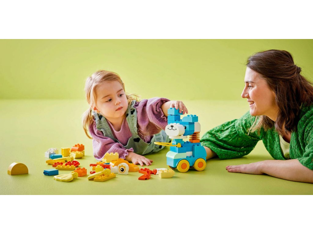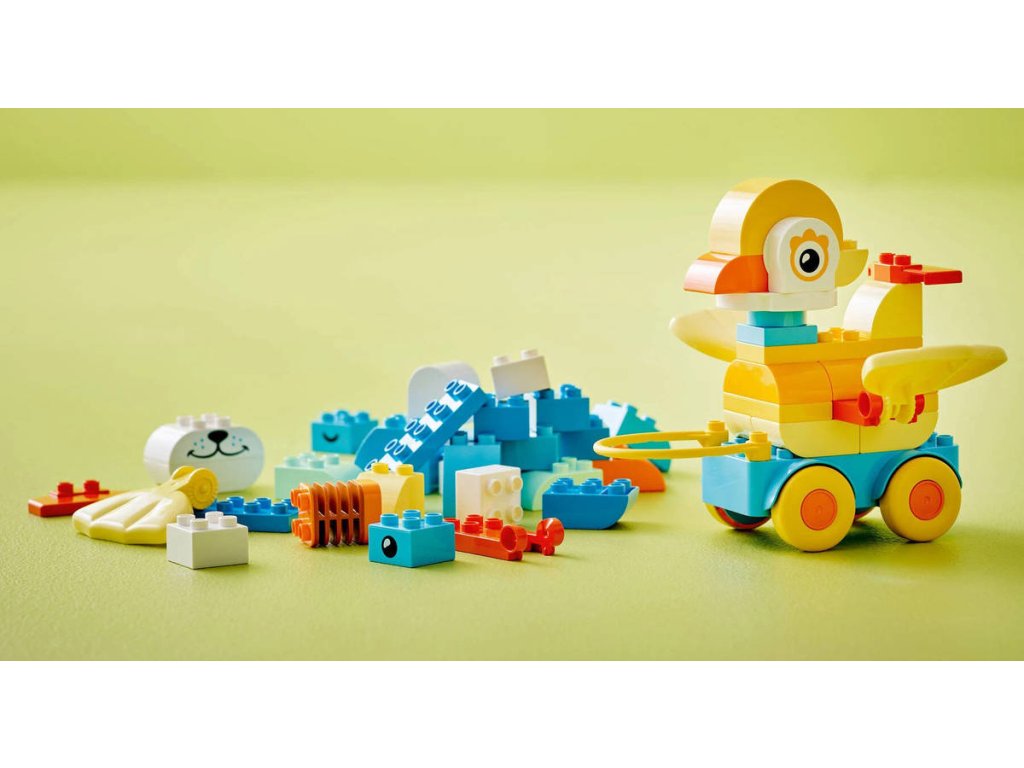 LEGO 10448 - Zvířátka na kolečkách z produktové řady LEGO DUPLO - Kvalitní dětská plastová stavebnice v krabici.Podpořte dětskou kreativitu se stavebnicí 3 v 1: Zvířátka na kolečkách. Malí milovníci zvířátek si užijí spoustu zábavy při stavění kachny, ryby nebo psa, které pak můžou přestavit na zcela nová zvířátka! Malé děti, které milují vozidla LEGO DUPLO, připevní figurky na podložky s kolečky a pak se s nimi vydají na projížďku – nebo je můžou tahat za rukojeť. Tento dárek pro batolata je plný pohyblivých funkcí, včetně ocasu a závěsných dílků, se kterými si děti užijí spoustu zábavy a zdokonalí své jemné motorické dovednosti. Děti zapojí své soustředění, trpělivost a představivost při nekonečném stavění a přestavování kreativních zvířátek. S touto hračkou se malé děti můžou těšit na spoustu hravých vzdělávacích momentů. Tato stavebnice LEGO DUPLO 3 v 1 obsahuje kostky, které se snadno rozebírají a děti se s ní snadno naučí, jak vyvážit podvozek, aby se jejich výtvor nepřevrátil.