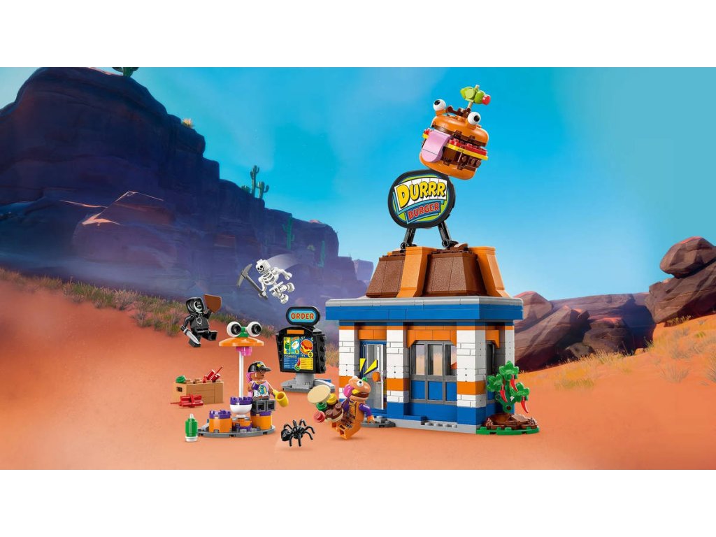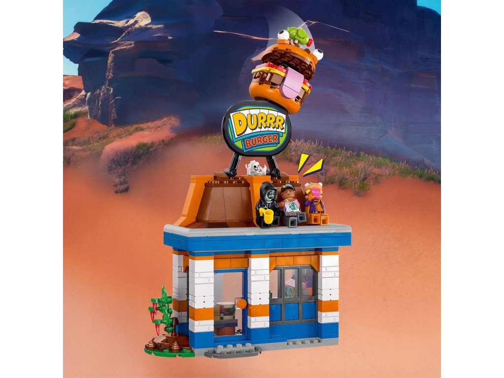 LEGO 77076 - Restaurace Durrr Burger z produktové řady LEGO FORTNITE - Kvalitní dětská plastová stavebnice v krabici.Děti popustí uzdu kreativitě se stavebnicí Restaurace Durrr Burger pro kluky a holky ve věku od 10 let. Tato videoherní stavebnice je inspirovaná oblíbenou lokací z videohry a fanoušci si s ní užijí spoustu zábavy. Malí gameři si užijí spoustu zábavy při skládání modulární Restaurace Durrr Burger, kterou si můžou přizpůsobit podle sebe a objevit v ní celou řadu zábavných detailů. Uvnitř budovy děti najdou pult s omáčkami, automat na nápoje a pokladnu. Venku se nachází posezení s šálkem a volským okem. Nechybí také odnímatelné podkroví s figurkou pavouka a dostatkem místa pro další doplňky, včetně lopaty a dynamitu. Minifigurky Beach Bombera, Beef Bosse, Grimeyho a kostlivce vdechnou stavebnici život a inspirují děti k nápaditému hraní. Tato stavebnice poslouží jako skvělý dárek s herní tematikou a obsahuje speciální outfit Beef Bosse do videohry LEGO Fortnite, který hráči odemknou naskenováním QR kódu na obalu návodu ke stavění. Stavebnice obsahuje 546 dílků.