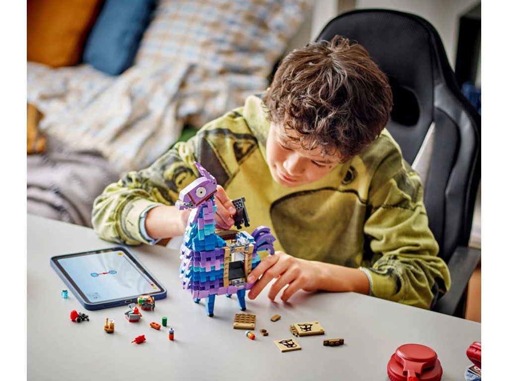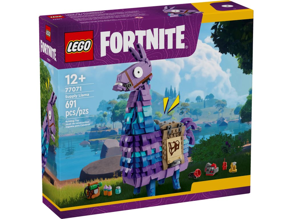 LEGO 77071 - Supply Llama z produktové řady LEGO FORTNITE - Dětská plastová stavebnice v krabici.Vdechněte život herním dobrodružstvím se stavebnicí Supply Llama pro gamery. Je inspirovaná videohrou LEGO Fortnite a fanoušci od 12 let si s ní vytvoří úžasnou hračku. Malí milovníci videoher si užijí hodiny zábavy při sestavování pinaty ve tvaru lamy, která je ve videohře LEGO Fortnite známá jako Supply Llama. Je napěchovaná zábavnými detaily, které inspirují ke kreativnímu hraní, má pohyblivou hlavu a otevírací tlamu, sedlo a spoustu parádního vybavení. To zahrnuje Grappler, Slurp Juice, Rough Ruby, Back Pack, Good Luck Charm, Slap Juice a Dynamite. Tyto věci jsou inspirované zábavnými předměty ze hry LEGO Fortnite a povzbuzují děti, aby znovu prožily své oblíbené herní okamžiky i po vypnutí videohry. Po sestavení tohoto modelu Fortnite fanoušci prozkoumají všechny jeho detaily. Model skvěle poslouží při hraní i jako výstavní kousek v pokoji nebo herně. Navíc také představuje promyšlený dárek pro hráče a fanoušky Fortnite.