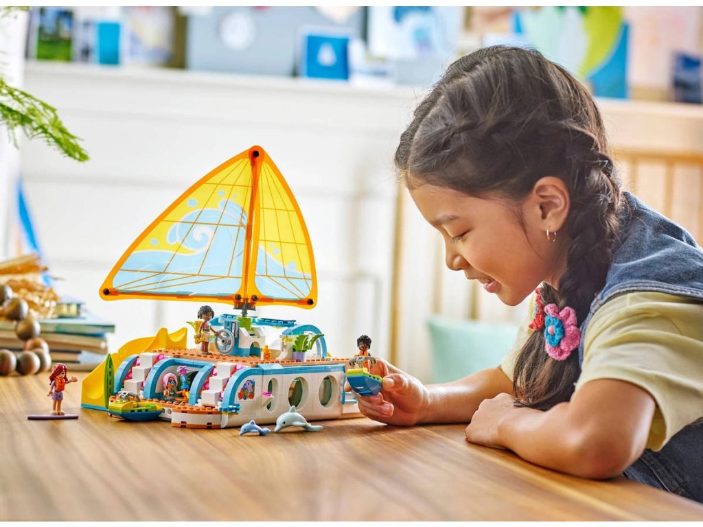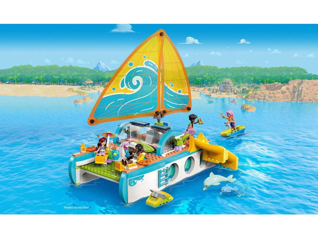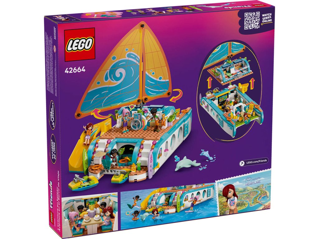 LEGO 42664 - Dobrodružství na jachtě z produktové řady LEGO FRIENDS - Kvalitní dětská plastová stavebnice v krabici.Představujeme vám zábavnou dárkovou stavebnici, která potěší všechny malé cestovatele! Stavebnice Dobrodružství na jachtě pro holky a kluky od 8 let obsahuje 4 minipanenky LEGO Friends a spoustu doplňků pro nápadité hraní. Propracovaná loď je plná realistických prvků, jako je plachta, která se pohybuje, když děti otáčejí kormidlem! Děti si vymyslí příběhy o Paisley, Zacovi, Celine a Sky, kteří se vydali na dobrodružnou plavbu lodí. V lodi najdete prostor na vaření, stolování, odpočinek a spaní - takže se skvěle hodí na vymýšlení nových příběhů. Objevte vířivku s nafukovačkou, herní koutek, prostor na spaní se 4 postelemi, sprchu a toaletu. Odejměte horní část jachty a získejte přístup k propracované kuchyňce s jídelnou. Děti objeví celou řadu doplňků během vaření a stolování s postavami. Mezi další prázdninové doplňky patří dalekohled na pozorování samice delfína a jejího mláděte, 2 vodní skútry, surf, ploutve, herní ovladače a další.