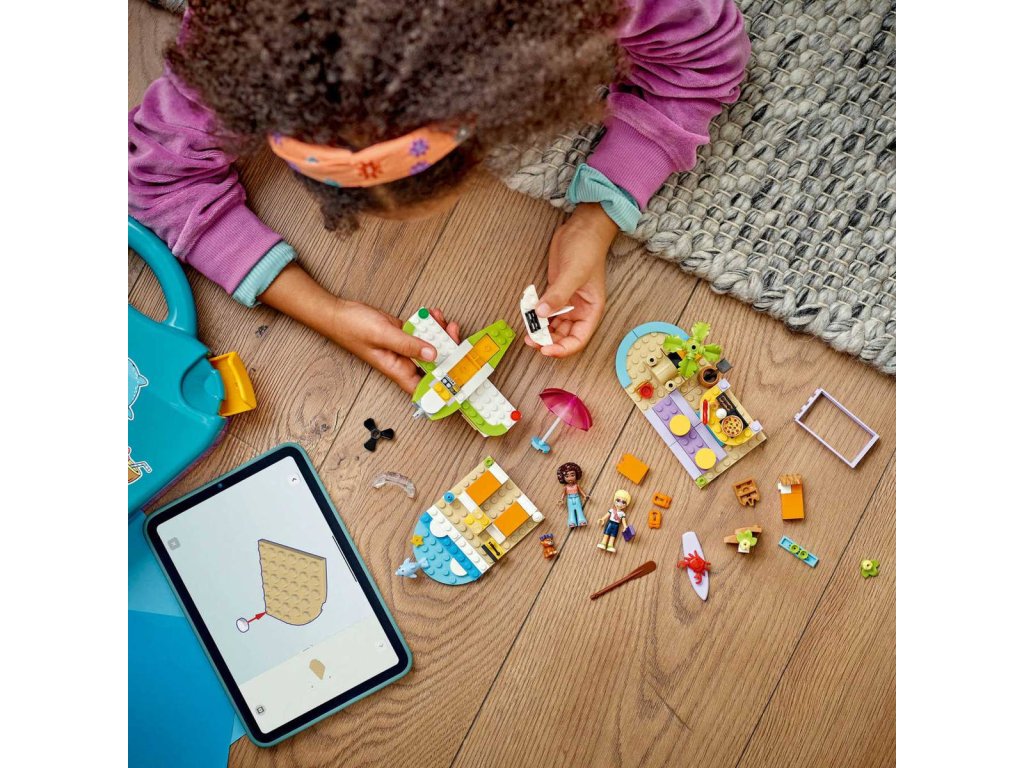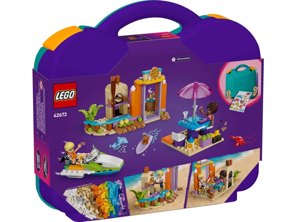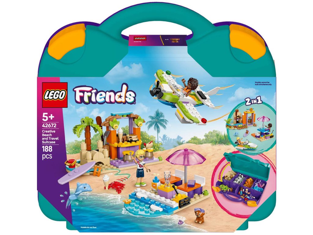 LEGO 42672 - Kreativní plážový a cestovní kufřík z produktové řady LEGO FRIENDS - Dětská plastová stavebnice v krabici.S touto stavebnicí 2 v 1 se děti vydají na kreativní cestu při stavění a přestavování plážových scén. Stavebnice Kreativní plážový a cestovní kufřík představuje skvělý dárek pro holky a kluky od 5 let. Malí stavitelé si poskládají 3 modely a pak je přestaví a vytvoří alternativní scénu – nebo z dílků postaví vlastní nápadité výtvory. Tato stavebnice obsahuje vše, co děti potřebují k sestavení hydroplánu s otočnou vrtulí, odpočinkové zóny se surfovacím prknem a plážové kavárny s hrady z písku, posezením a zmrzlinou. Stavebnici lze přestavět na model motorového člunu, venkovní posezení a pizzerii s pecí na pizzu. Součástí stavebnice jsou 2 minipanenky a figurky psa a delfína, se kterými si užijete spoustu zábavného hraní. Po sestavení a přestavbě modelů můžete všechny dílky sbalit do kufříku a připravit se na další dobrodružství. Součástí stavebnice je arch se zábavnými samolepkami, takže si děti můžou kufr přizpůsobit podle sebe.