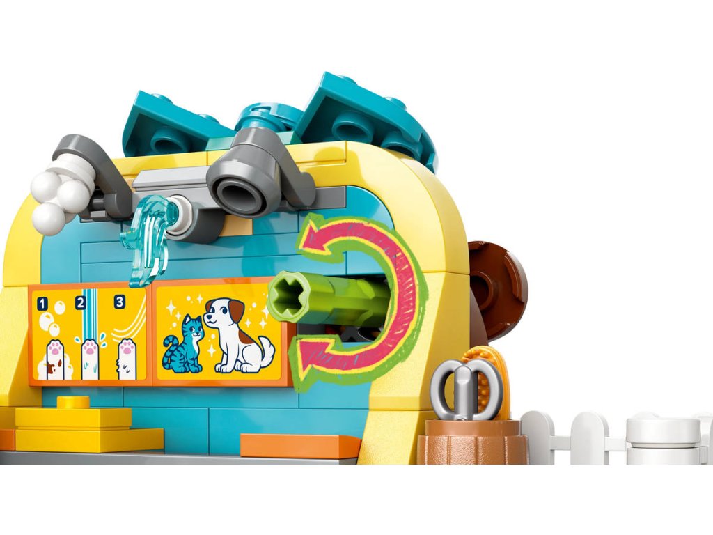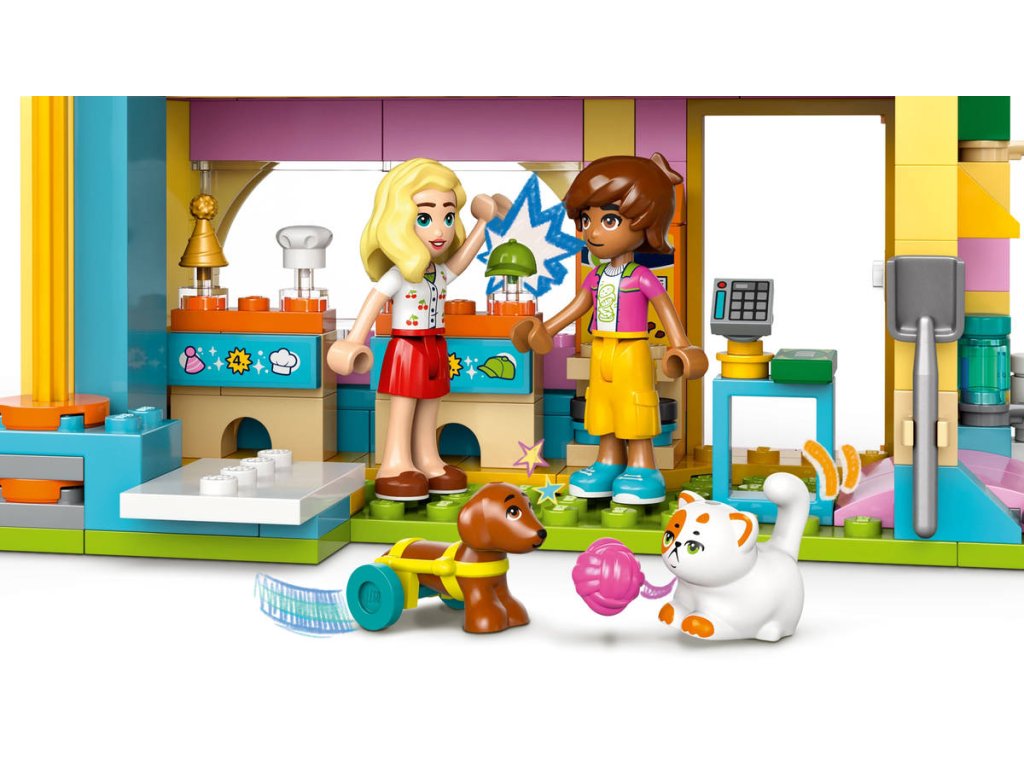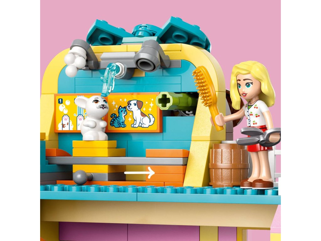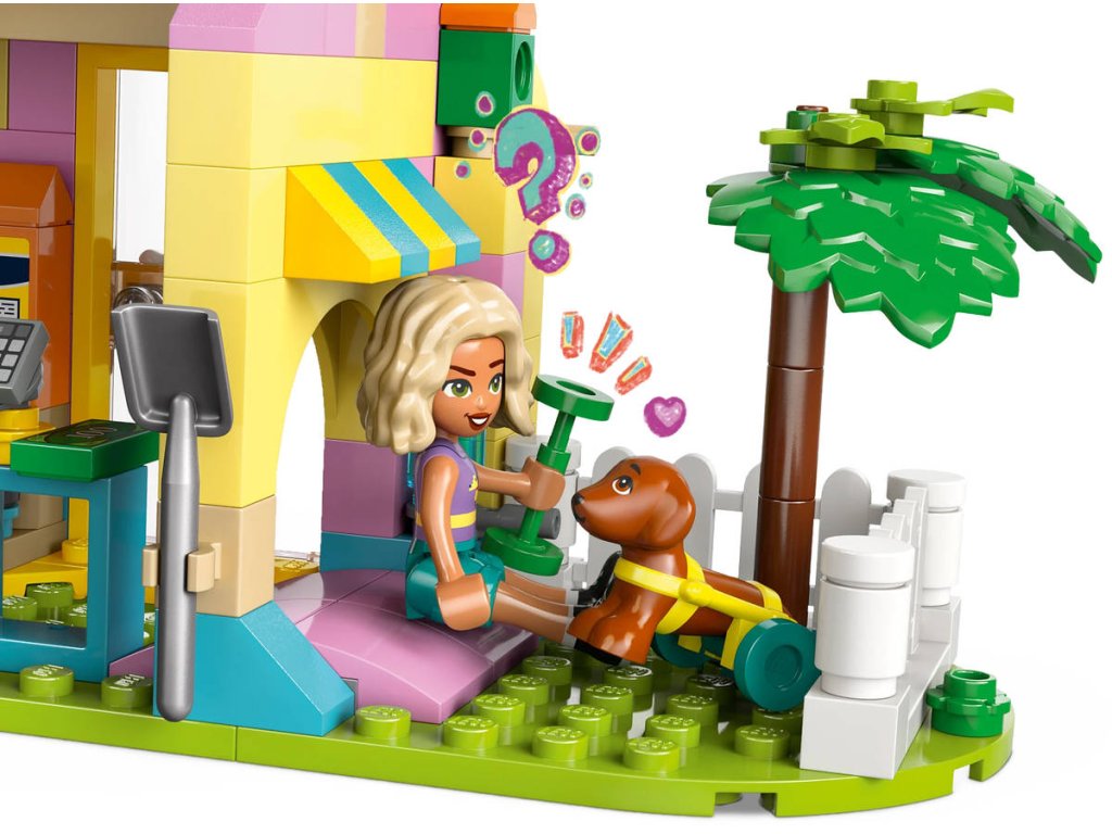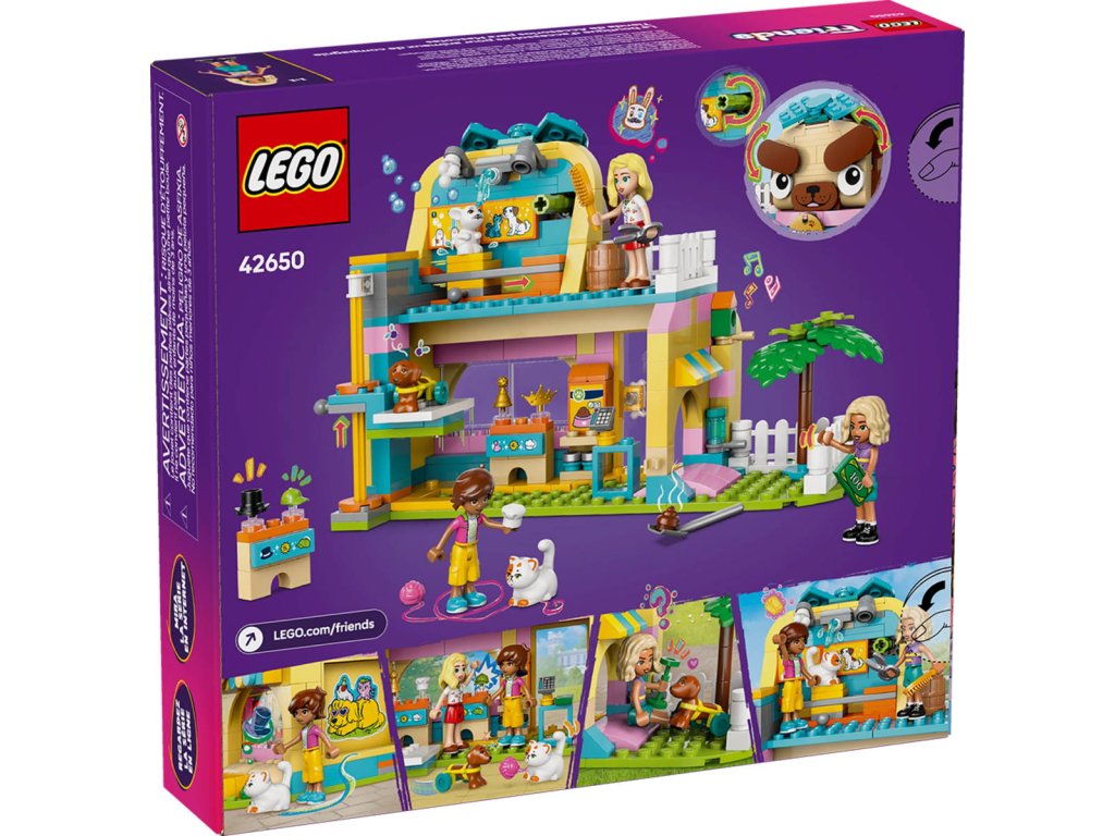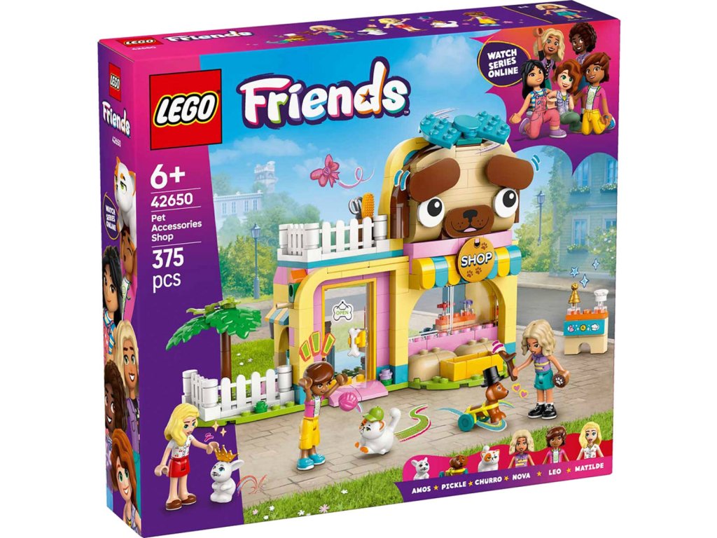 LEGO 42650 - Obchod s doplňky pro mazlíčky z produktové řady LEGO FRIENDS. Dětská plastová stavebnice v krabici.Představujeme vám zábavný dárek k narozeninám nebo jakékoli jiné příležitosti pro děti, které milují hraní na péči o zvířátka! Holky, kluci a všichni milovníci mazlíčků od 6 let si užijí hodiny zábavy se stavebnicí Obchod s doplňky pro mazlíčky. Součástí jsou 3 minipanenky a figurka kočky, psa a králíčka pro kreativní hraní. Připojte se k Nově, Leovi a Matildě, kteří svým chlupatým kamarádům Churrovi, Pickleovi a Amosovi vybírají nové čepice a doplňky. Odvezte domácí mazlíčky výtahem do místnosti, kde je můžete vykoupat. Dopravníkem je přesuňte přes stanici na namydlení, koupání a sušení. Pak si prohlédněte doplňky, které jsou ve slevě, včetně kuchařské čepice, kšiltovky a klubíčka příze. Nechybí ani peníze a pokladna, se kterými si děti můžou hrát na zákazníky. Pozor, ať nešlápnete na psí hovínko! Naštěstí máte po ruce lopatu na uklízení. Prozkoumejte i další vtipné detaily, jako je design budovy v podobě pejska s pohyblivým obočím a točící se mašlí. Objevte i další stavebnice a dárky LEGO ze světa LEGO Friends (stavebnice se prodávají samostatně).