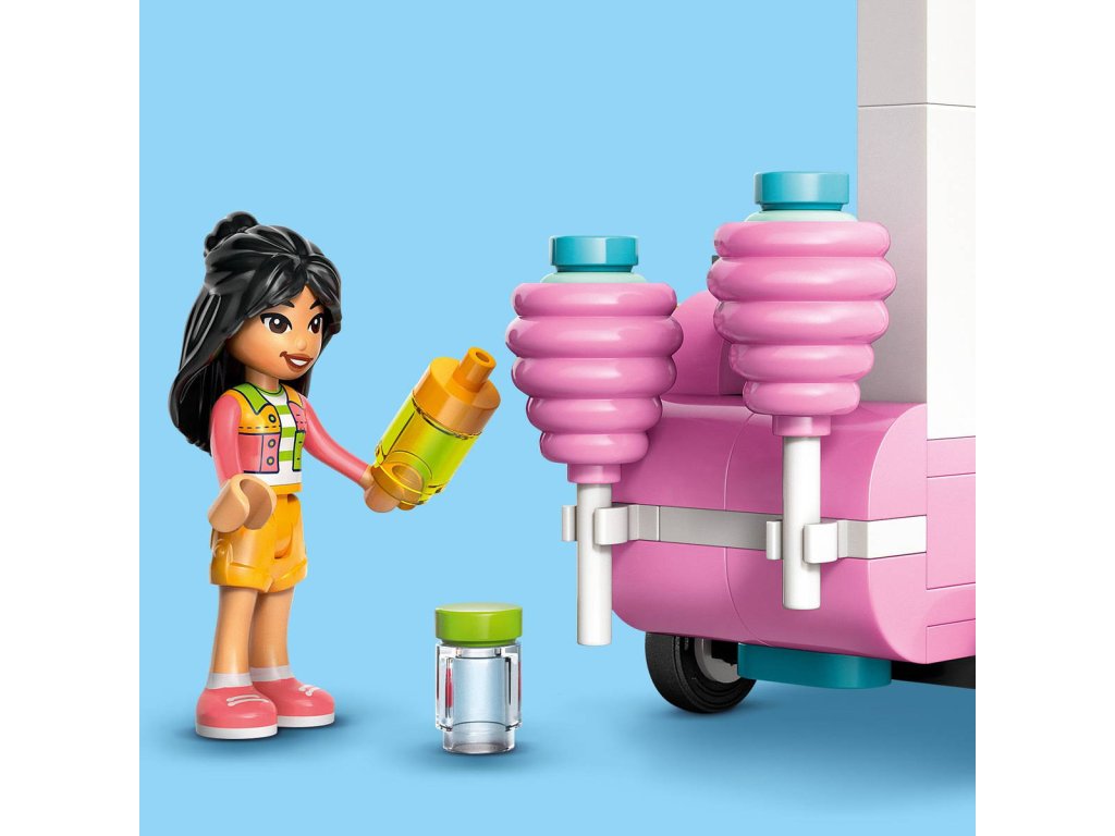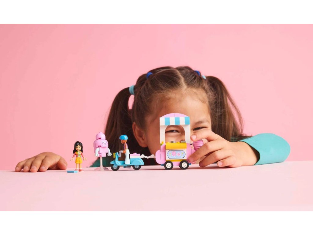 LEGO 42643 - Stánek s cukrovou vatou a skútr z produktové řady LEGO FRIENDS - Dětská plastová stavebnice v krabici.Inspirujte děti od 6 let k sladké hře na postavy se stavebnicí Stánek s cukrovou vatou a skútr. Součástí stavebnice jsou 2 minipanenky LEGO Friends a sestavitelný pojízdný vozík s občerstvením, skútr, maskot a doplňky. Holky, kluci a malí stavitelé, kteří milují kreativní hraní, si s touto stavebnicí užijí hodiny hraní vlastních zábavných příběhů. Vymyslí příběh Liann a Jamily, které rády tráví čas u stánku s cukrovou vatou. Součástí vozíku LEGO na kolečkách je miska s ozdobami na přípravu cukrové vaty. Nechybí ani pokladna a peníze, takže si děti můžou zinscenovat různé interakce se zákazníky.