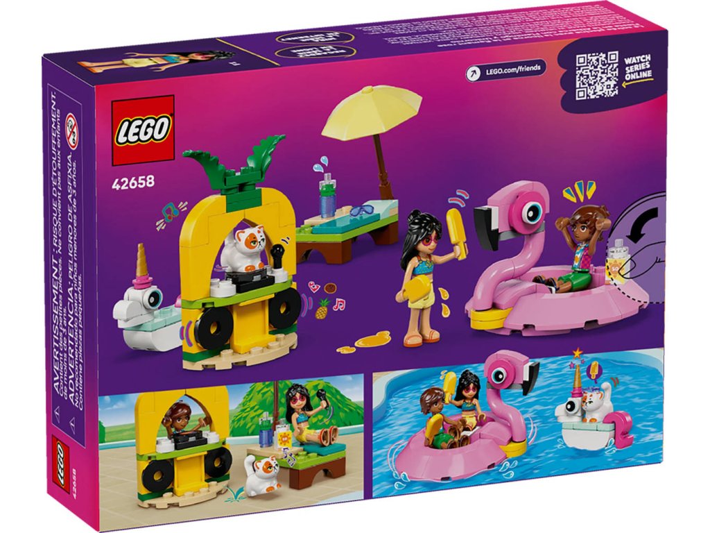 LEGO 42658 - Zábava u bazénu s jednorožcem a plameňákem z produktové řady LEGO FRIENDS - Kvalitní dětská plastová stavebnice v krabici.Stavebnice Zábava u bazénu s jednorožcem a plameňákem přináší spoustu herních možností a děti se s ní ponoří do vyprávění příběhů. Tato stavebnice pro holky a kluky od 5 let obsahuje 2 sestavitelné nafukovací hračky, doplňky k bazénu, 2 minipanenky LEGO Friends a figurku kočky. Děti můžou vymýšlet kreativní příběhy s Leem, Liann a Churrem a užít si zábavnou párty u bazénu s nafukovacím jednorožcem a plameňákem. V sestavitelné nafukovačce v podobě plameňáka je místo pro 2 postavy a součástí je držák na 2 nanuky. Menší nafukovačka s motivem jednorožce je jako stvořená pro kocoura Churra, který se rád přidá. Součástí stavebnice je také křeslo, djský pult s točící se deskou a mikrofonem, opalovací krém a nápoj pro ještě nápaditější hraní.