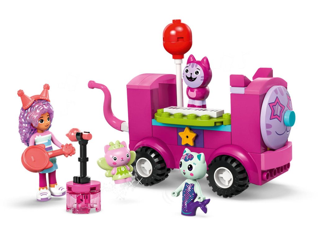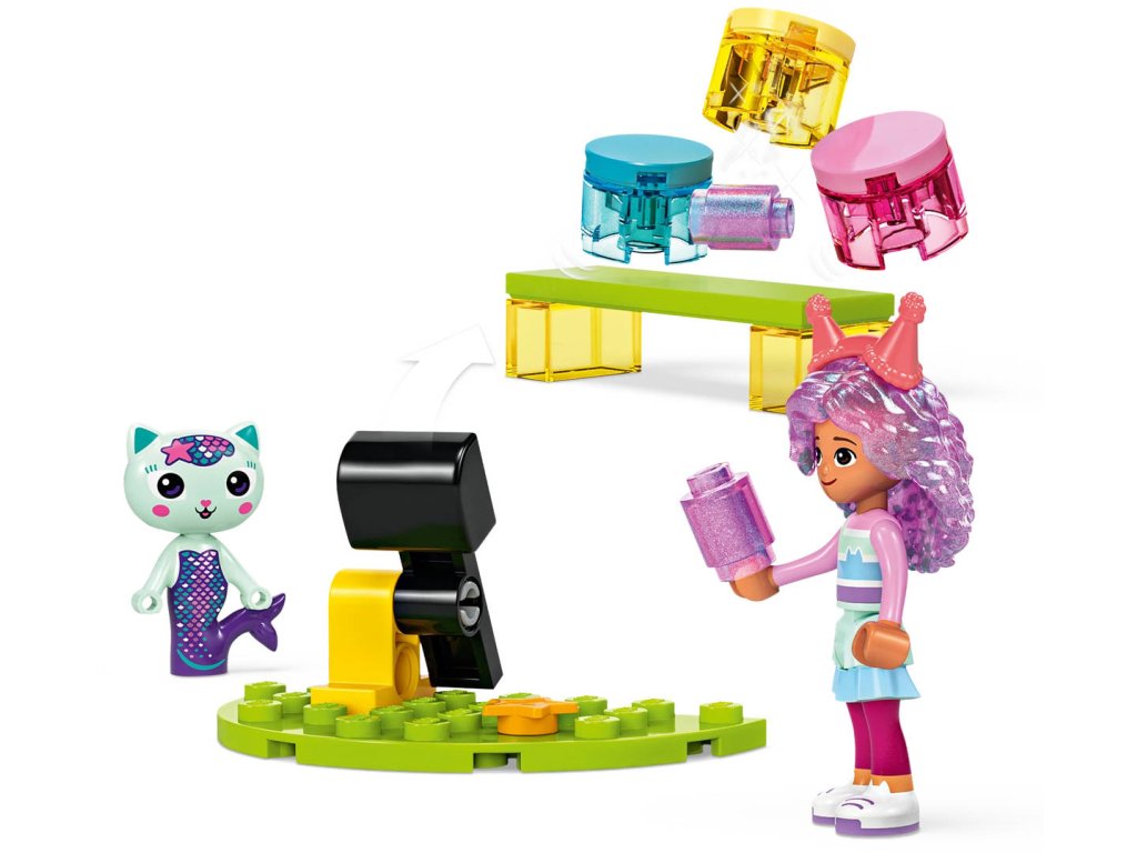 LEGO 10797 - Gábi a její párty-místnost, z produktové řady GABBY´S DOLLHOUSE. Dětské plastové kostky v krabici.Gábi a její párty-místnost je perfektní diskotéková stavebnice pro fanoušky seriálu Gábinin kouzelný domek od studia DreamWorks Animation. Táto zábavná hračka pomůže dětem od 4 let rozvíjet sebedůvěru, soustředění a schopnost řešit problémy. Tato diskotéková stavebnice je skvělá hračka pro kluky i holky! Najdete v ní Gábi, „DJ“ Daniela Jamese Kocoura, Vílu kočičku a Rybočku a spoustu hudebních párty hraček včetně pohyblivého párty autobusu se zabudovanými klávesami, otáčejícího se parketu, kytary, 2 mikrofonů a třpytivé disco koule – a vše je připraveno na nekonečné nápadité hraní! Mezi doplňky patří balónky a kolečkové brusle na diskotéku, popkorn, 2 sklenice ledové tříště v odpočinkové zóně a katapult s plechovkami pro hru na shazování. Pro Gábi je tu připraven dort a dárečky, které budou doručeny po skluzavce. Součástí stavebnice je velká začátečnická kostka, která dětem pomůže začít stavět. Barevný obrázkový návod skvěle poslouží jako intuitivní průvodce stavěním.