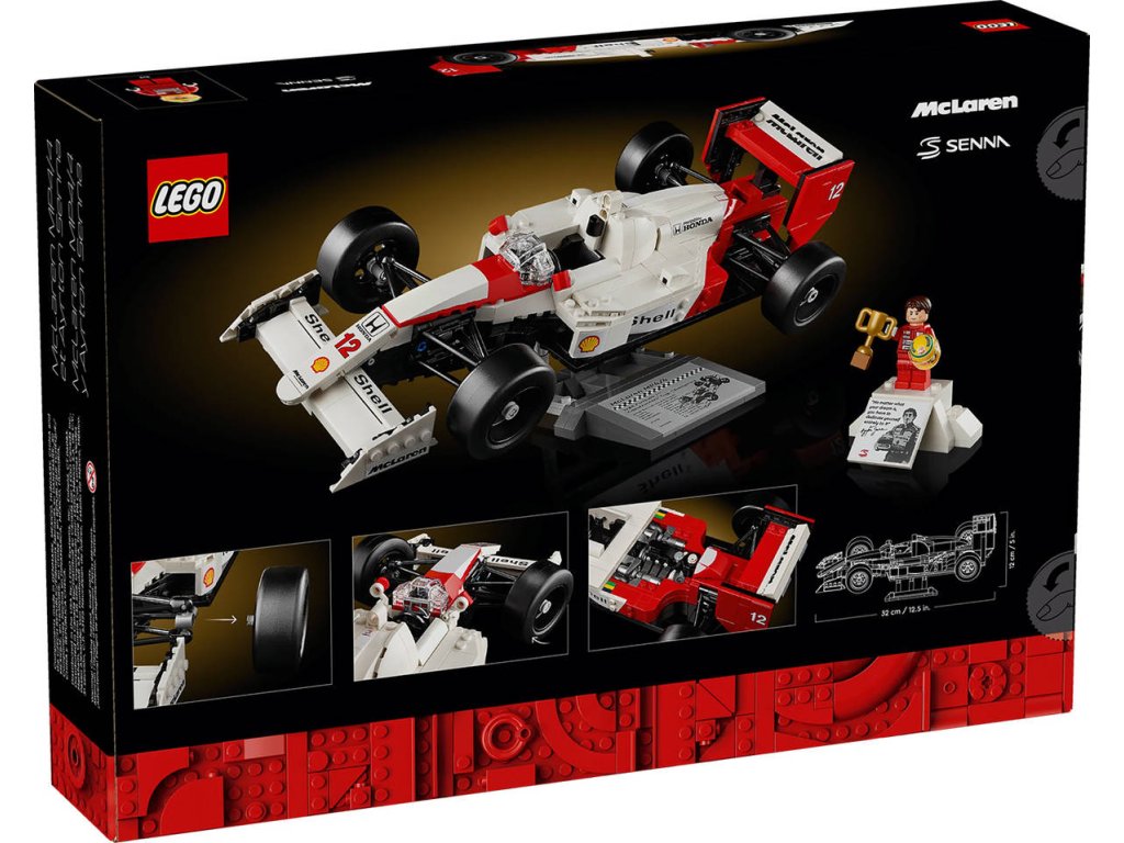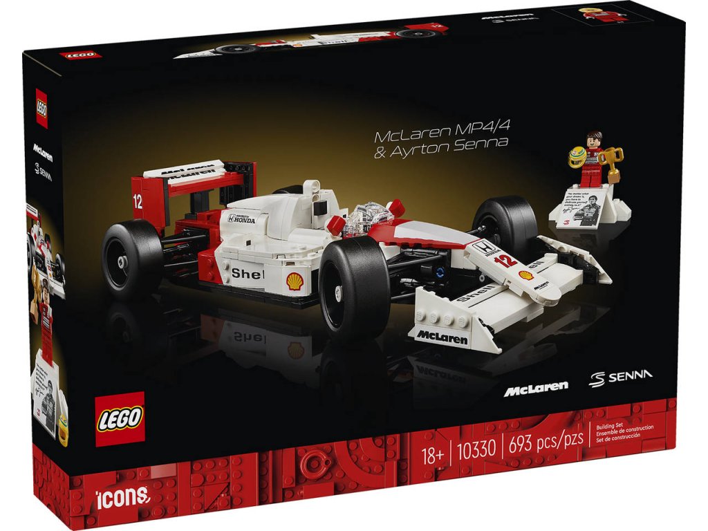 LEGO 10330 - Závodní auta McLaren MP4/4 + Ayrton Senna z produktové řady LEGO ICONS - Plastová stavebnice pro dospělé.Potěšte fanoušky závodních aut stavebnicí McLaren MP4/4 a Ayrton Senna. Sada byla navržena ve spolupráci s automobilkou McLaren a značkou SENNA a nechybí jí autentické detaily, díky kterým model dokonale připomíná legendární předlohu z roku 1988, jež se řadí mezi nejúspěšnější závodní vozy F1 vůbec. Součástí stavebnice je také výstavní minifigurka Ayrtona Senny. Součástí modelu vozu McLaren MP4/4 je funkční řízení, spojovací tyč, upravitelné zadní křídlo, hladké pneumatiky, zrcátka, řadicí páka a propracovaný turbomotor V6. Nechybí podstavec na vystavení a cedulka se zajímavými statistikami. Minifigurka Ayrtona Senny má vlastní podstavec na vystavení s informacemi, slavným citátem a fotografií Ayrtona Senny.