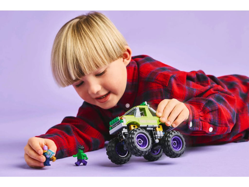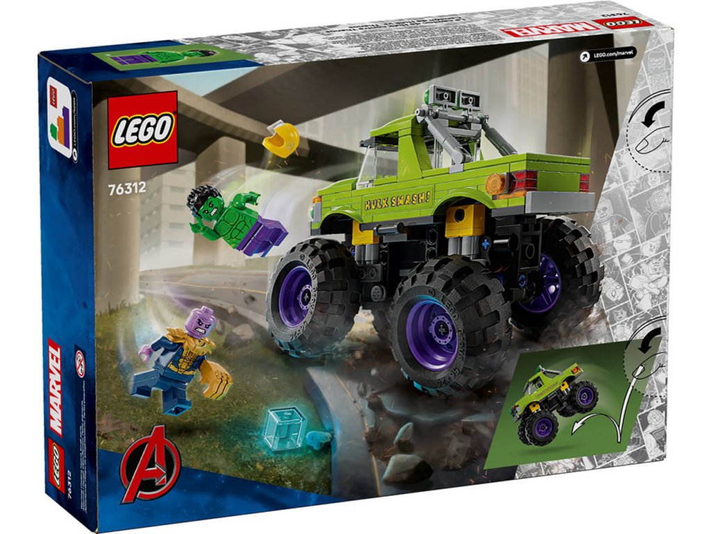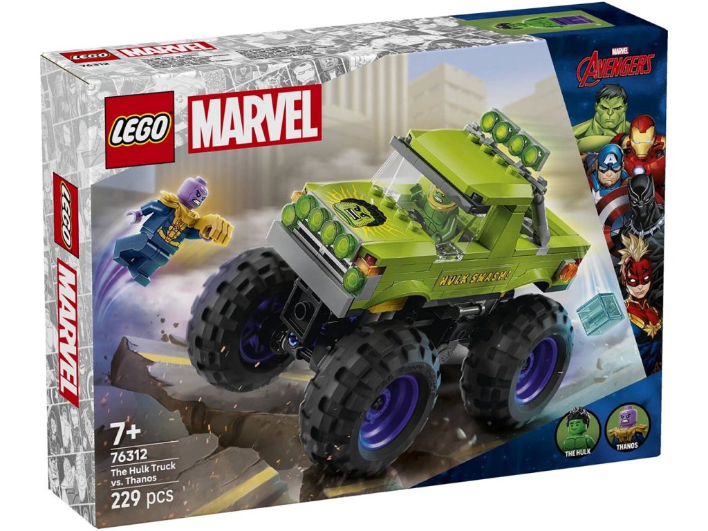 LEGO 76312 - Hulkův truck vs. Thanos z produktové řady LEGO MARVEL - Kvalitní dětská plastová stavebnice.Stavebnice Hulkův truck vs. Thanos obsahuje Hulkův obří truck a 2 minifigurky superhrdinů. Tento vysoce kvalitní dárek pro kluky a holky od 7 let představuje skvělý dárek pro děti, které milují filmy Marvel Avengers, velké trucky a dobrodružství se stavebnicemi LEGO. Tento sestavitelný výkonný truck LEGO | Marvel obsahuje minifigurku Hulka s odnímatelnou helmou a minifigurku Thanose s teseraktem a Rukavicí nekonečna. Superhrdinský truck má zvedací kabinu s přístupem na sedadlo řidiče a místem pro minifigurku Hulka. Vnější strana trucku je zelená a zdobí ji nápis „Hulk Smash!“ a Hulkův obličej. Díky velkým otočným kolům, robustní konstrukci a odpružení zvládne tento mega truck i ty nejnáročnější mise. Pro ještě větší digitální zábavu si stavitelé můžou přibližovat a otáčet modely ve 3D a sledovat svůj pokrok pomocí zábavné a intuitivní aplikace LEGO Builder. Model obsahuje 229 dílků.