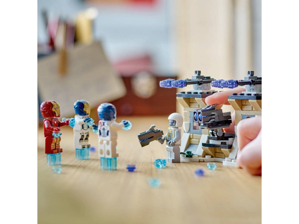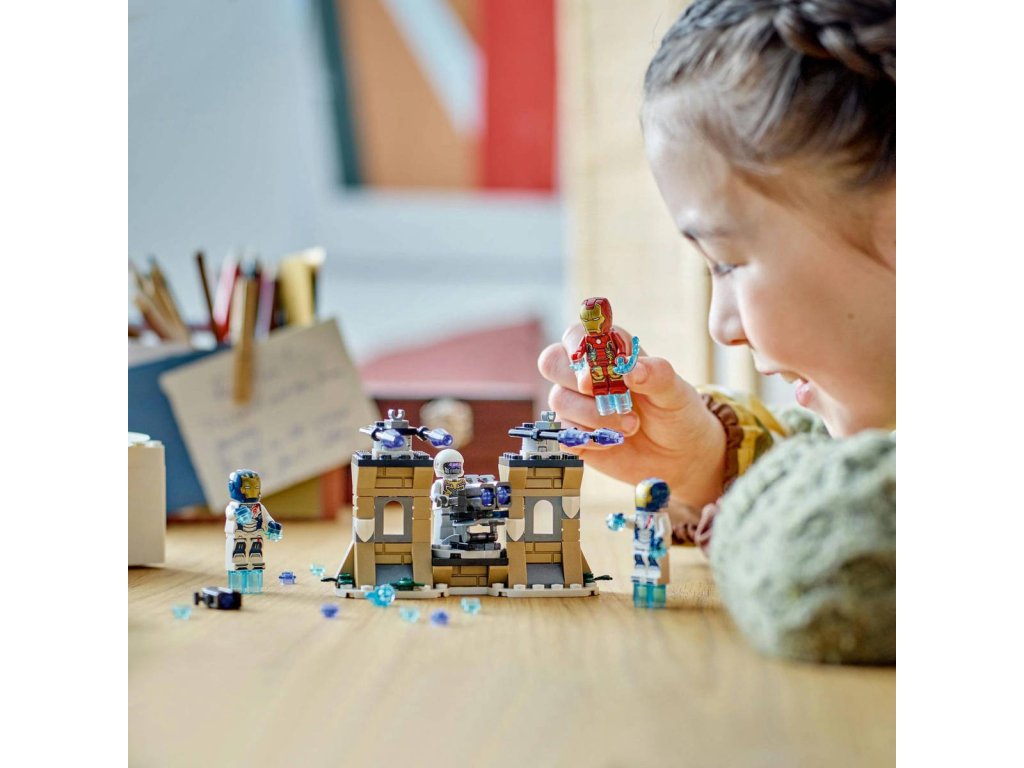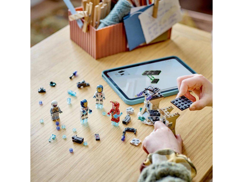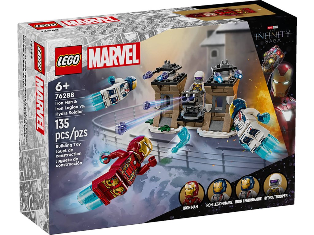 LEGO 76288 Iron Man a Železná legie vs. voják Hydry - z produktové řady LEGO MARVEL. Dětské plastové kostky v krabici.Dobrodružná superhrdinská stavebnice Iron Man a Železná legie vs. voják Hydry připomíná scénu z filmu Avengers: Age of Ultron od Marvel Studios, kde Iron Man a 2 Železní legionáři letí na opevněnou základnu vojáka Hydry. Tato superhrdinská stavebnice je plná skvělých funkcí a doplňků, takže se jedná o skvělou stavebnici pro děti, zejména pro fanoušky Avengers ve věku od 6 let. Stavebnice obsahuje 4 minifigurky: Iron Mana, 2 Železné legionáře, a vojáka Hydry. Sestavitelný model Iron Mana má otevírací hledí a drží energetický blaster. Voják Hydry má vystřelovač. Součástí jsou jasně modré kostky, které vytvářejí dojem, že minifigurky létají. Sestavitelný model základny Hydry zahrnuje 2 vystřelovače připevněné k otočné podlaze, kam mohou děti postavit vojáka Hydry, aby mířil na přicházející superhrdiny.Na vrcholu věží základny jsou 2 páry odpalovačů raket (nestřílejících) k odvrácení útoku. K doplňkovým digitálním funkcím se dostanete prostřednictvím aplikace LEGO Builder.