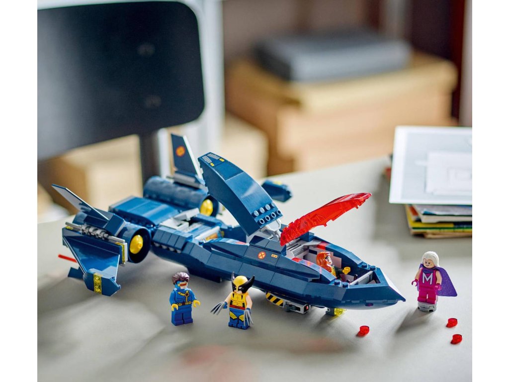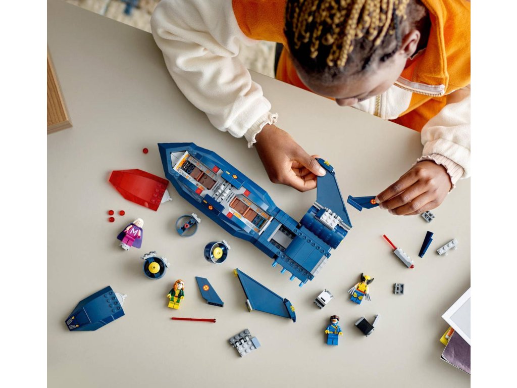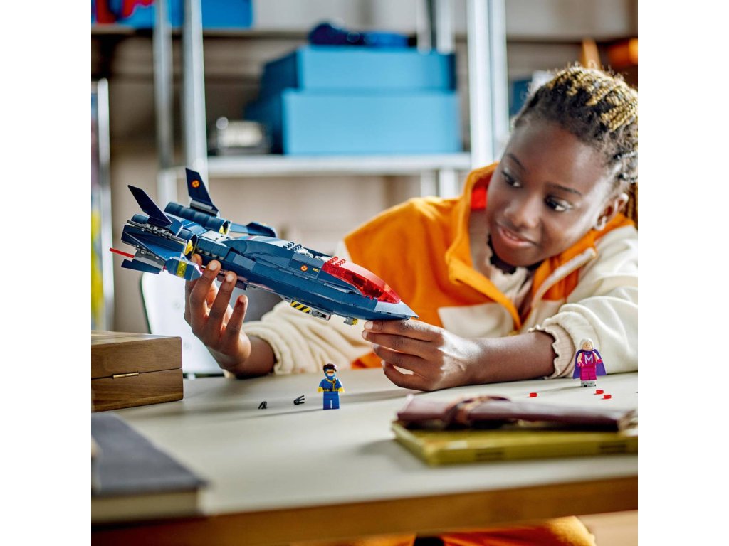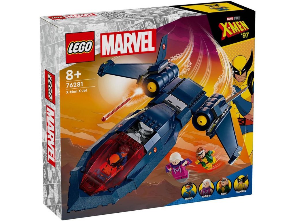 LEGO 76281 - Tryskáč X-Men X-Jet z produktové řady LEGO MARVEL - Dětské plastové kostky v krabici.Stavebnice Tryskáč X-Men X-Jet potěší každého fanouška parádních letounů, stavebnic z řady LEGO Marvel a milovníky seriálu X-Men ’97 od studia Marvel. Trendy stavebnice Tryskáč X-Men X-Jet představuje skvělý dárek pro malé superhrdiny od 8 let a povznese jejich hraní na zcela novou úroveň. Tento úchvatný model inspirovaný tryskáčem X-Jet ze seriálu X-Men ’97 inspiruje malé stavitele k nekonečným akčním dobrodružstvím s minifigurkami Cyclopse, Rogue, Magneta a Wolverina. V sestavitelném modelu najdete dvojitý kokpit s místem pro 4 minifigurky, 2 vystřelovače na každé straně tryskáče a 2 pružinové vystřelovače pod křídly. Nechybí ani 2 odnímatelné boxy, do kterých děti uloží další dílky na vystřelování, a dlouhé Wolverinovy drápy, které lze připojit k minifigurce. Pro ještě více digitální zábavy je zde zábavná a intuitivní aplikace LEGO Builder, kde mohou stavitelé přibližovat a otáčet modely ve 3D a sledovat postup.