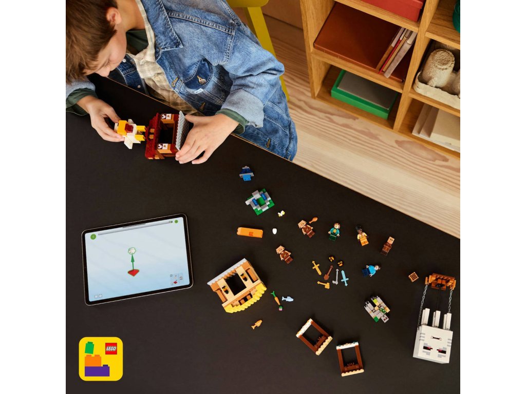 LEGO 21273 - Balón v podobě ďasa a útok na vesnici z produktové řady LEGO MINECRAFT - Kvalitní dětská plastová stavebnice v krabici.Balón v podobě ďasa a útok na vesnici je videoherní stavebnice inspirovaná scénou z filmu Minecraft. Tato vysoce kvalitní stavebnice LEGO Minecraft dětem přináší výbušnou akci během útoku z balónu. Tato videoherní stavebnice LEGO představuje skvělý dárek pro kluky a holky od 10 let. Stavebnice obsahuje oblíbené postavy z videohry: Steva, Natalii, Dawn, 2 pigliny, balón v podobě ďasa, vesničana, kuře a pohyblivou figurku železného golema. V balónu je prostor pro pigliny a obsahuje vystřelovač disků. Ve vesnici najdete stánky z trhu, Steveovu restaurace se smaženým kuřecím masem, jeho chata na tvoření a fontána, kterou děti „vyhodí do povětří“ pomocí vestavěného prvku. Střechu restaurace zdobí velký model slepice se zábavnou funkci snášení vajec. Děti si užijí porci digitální zábavy s aplikací LEGO Builder, která jim umožňuje přibližovat modely, otáčet je ve 3D a sledovat postup při stavění.