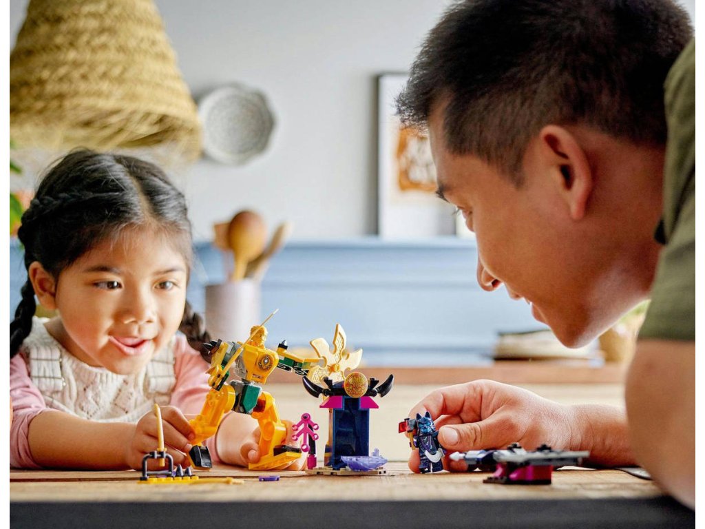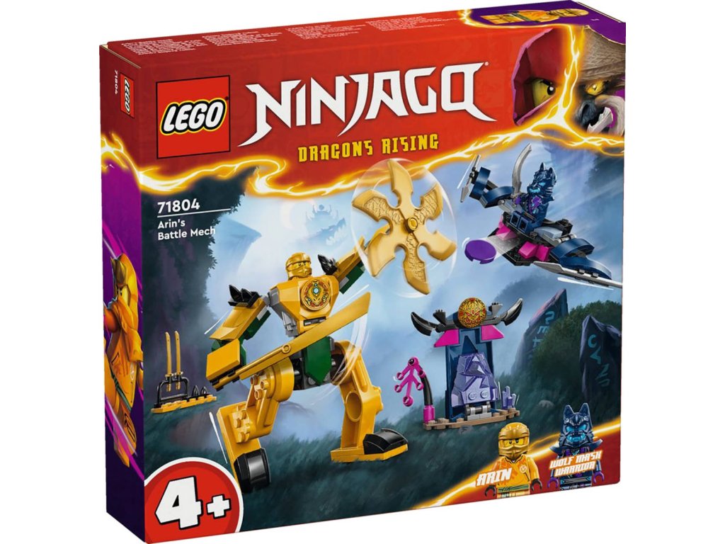 LEGO 71804 - Arinův bojový robot z produktové řady LEGO NINJAGO - Dětské plastové kostky v krabici.Se stavebnicí Arinův bojový robot si děti od 4 let procvičí skládání kostek a připojí se k hrdinům ve snaze zachránit jejich dračí přátele. Součástí této akční stavebnice je úchvatný robot, se kterým si děti připomenou strhující dobrodružství z 2. řady televizního seriálu NINJAGO Dračí povstání. Součástí této stavebnice LEGO jsou 2 minifigurky: Arin s katanou a válečník s vlčí maskou s mečem. Arin se vejde do pohyblivého robota s velkým mečem a otáčející se čepelí a válečník s vlčí maskou dokáže létat na kluzáku s pohyblivými křídly, vystřelovačem disků a 2 oštěpy. Nechybí ani křišťálová jeskyně z kostek, ve které najdete palici roztříštění a stojan na zbraně se 2 zlatými katanami. Tato stavebnice s nindži byla navržena pro děti od 4 let, které se teprve seznamují s kostkami LEGO. Nechybí začátečnická kostka, jež představuje částečně sestavenou základnu, a děti se tak mohou bez zaváhání pustit do stavění.