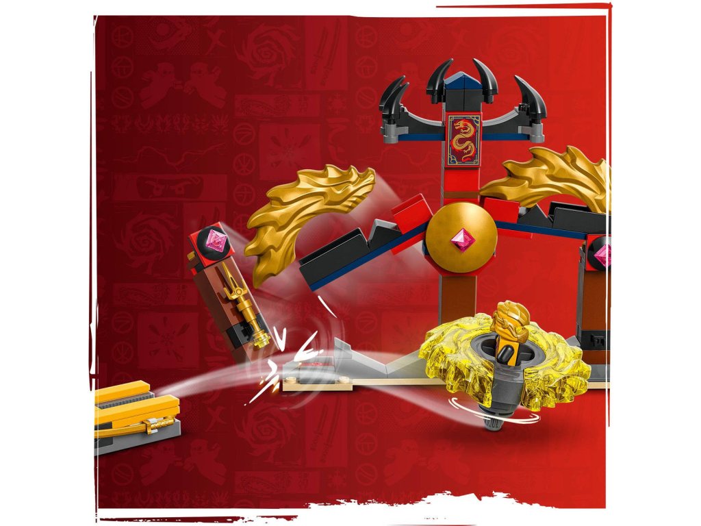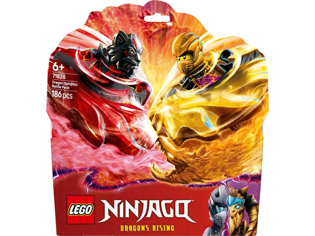 LEGO 71826 - Bitevní balíček dračího Spinjitzu z produktové řady LEGO NINJAGO. Dětská plastová stavebnice v krabičce.S akční stavebnicí Bitevní balíček dračího Spinjitzu si kluci a holky od 6 let připomenou úžasné akční scény ze 3. řady televizního seriálu NINJAGO Dračí povstání. Tato malá akční stavebnice LEGO obsahuje model chrámu s bojovou arénou, 2minifigurky Arina a Rase a 2 dračí Spinjitzu spinnery, které děti umístí do odpalovačů a během bitev je proto sobě vystřelovat. Děti si vychutnají napínavé dobrodružné souboje dobra proti zlu s Arinovým žlutým spinnerem a Rasovým červeným spinnerem, kt eré mají odnímatelné dílky síly. Tyto postavy ze světa NINJAGO můžou své spinnery vylepšovat zlatými prvky, které můžou vyhrát zasažením a zničením bojové arény.
