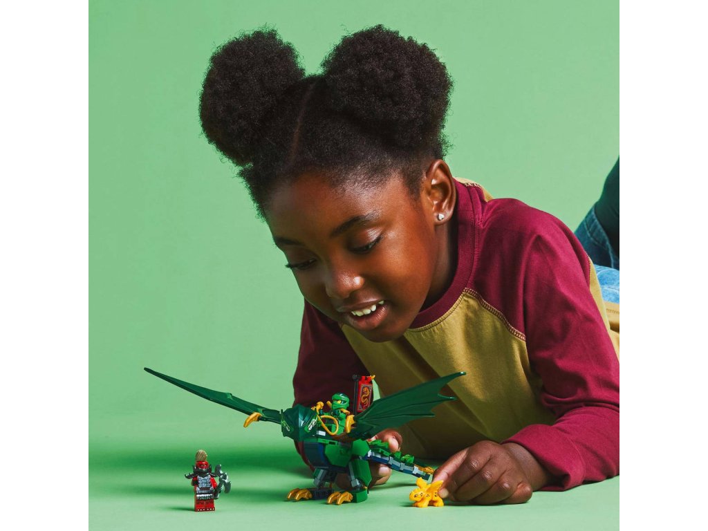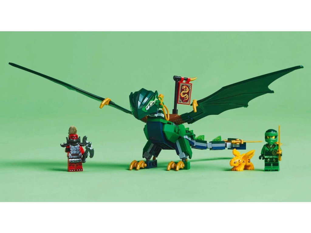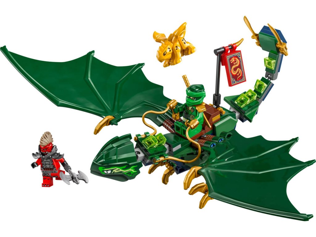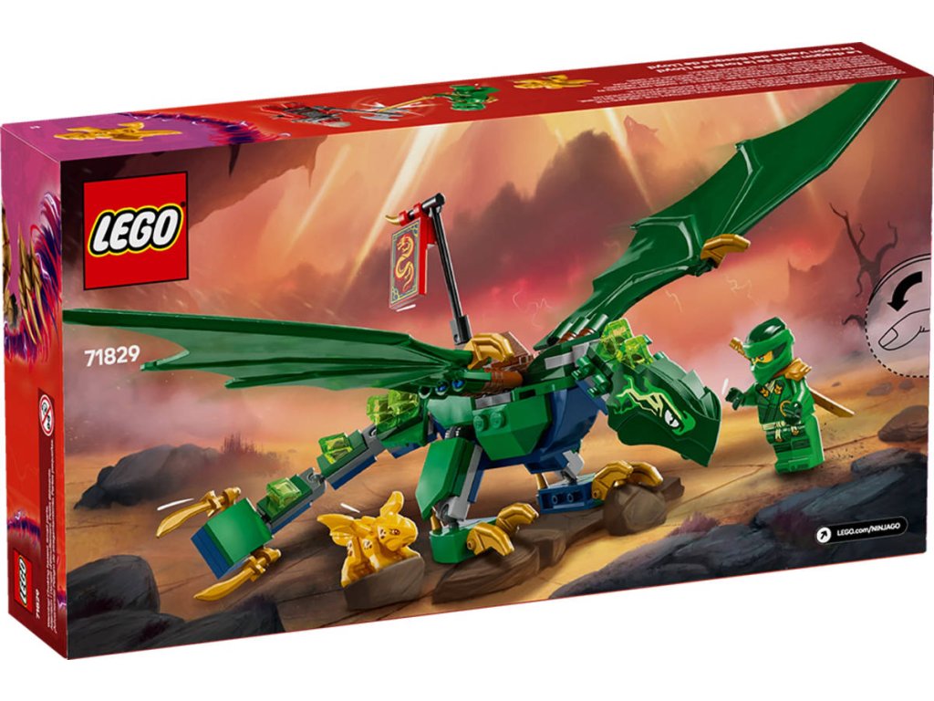 LEGO 71829 - Lloydův zelený lesní drak z produktové řady LEGO NINJAGO - Dětská plastová stavebnice v krabici.Kluci a holky od 6 let se se stavebnicí Lloydův zelený lesní drak vznesou do oblak a připomenou si napínavé letecké scény z 3. řady televizního seriálu NINJAGO Dračí povstání. Součástí je impozantní drak s pohyblivým ocasem, krkem, nohama, velkými křídly a rukama, a navíc sedlo na jeho hřbetu, na které lze usadit minifigurku. Tato stavebnice LEGO NINJAGO s drakem obsahuje také 2 minifigurky: Lloyda vyzbrojeného zlatou katanou a zlotřilého dračího válečného zvěda se sekerou, a nechybíani zlatý model dračího mláděte, se kterým si děti vyzkouší, jaké to je pečovat o malého tvora.