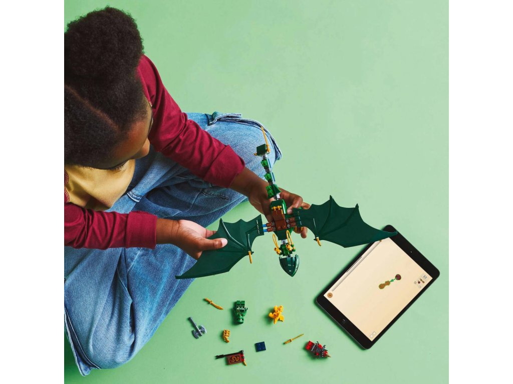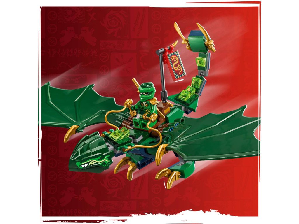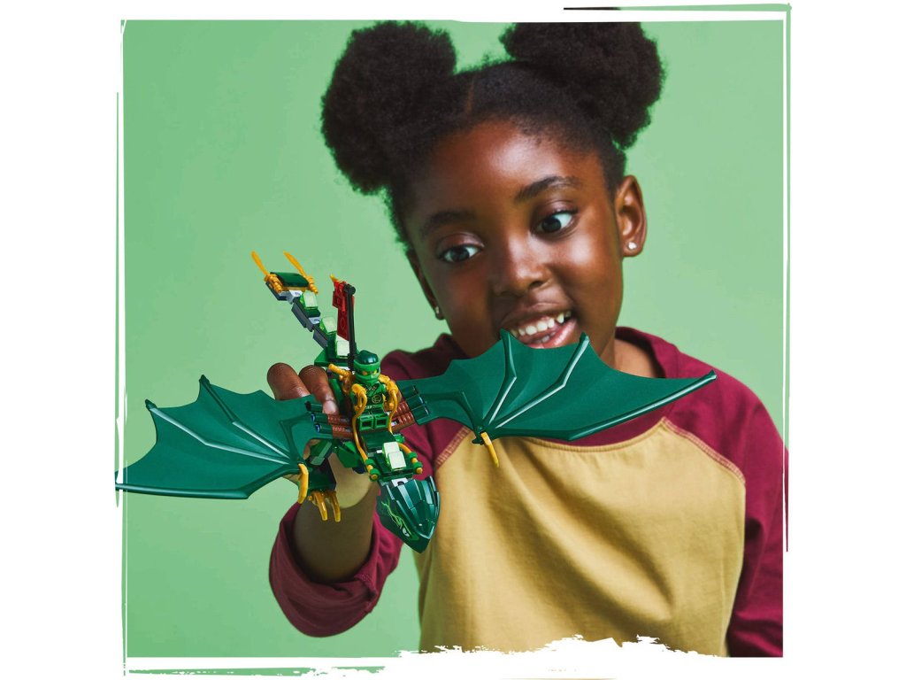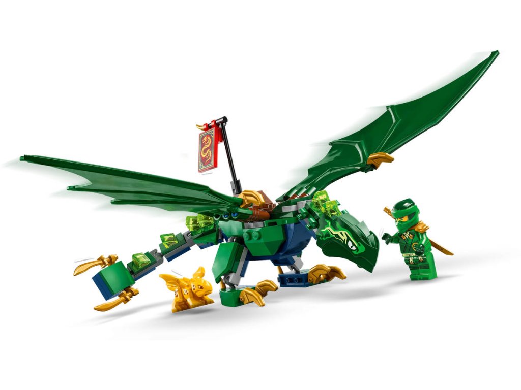 LEGO 71829 - Lloydův zelený lesní drak z produktové řady LEGO NINJAGO - Dětská plastová stavebnice v krabici.Kluci a holky od 6 let se se stavebnicí Lloydův zelený lesní drak vznesou do oblak a připomenou si napínavé letecké scény z 3. řady televizního seriálu NINJAGO Dračí povstání. Součástí je impozantní drak s pohyblivým ocasem, krkem, nohama, velkými křídly a rukama, a navíc sedlo na jeho hřbetu, na které lze usadit minifigurku. Tato stavebnice LEGO NINJAGO s drakem obsahuje také 2 minifigurky: Lloyda vyzbrojeného zlatou katanou a zlotřilého dračího válečného zvěda se sekerou, a nechybíani zlatý model dračího mláděte, se kterým si děti vyzkouší, jaké to je pečovat o malého tvora.