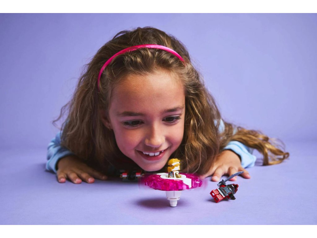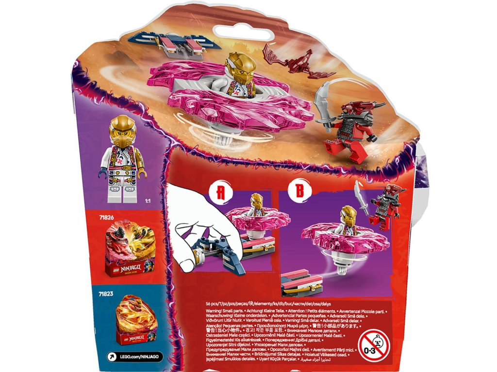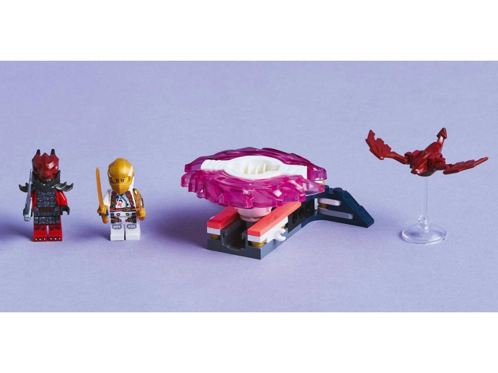 LEGO 71824 - Sorin dračí Spinjitzu spinner z produktové řady LEGO NINJAGO - Dětská plastová stavebnice v krabičce.S akční stavebnicí Sorin dračí Spinjitzu spinner si kluci a holky od 6 let připomenou strhující scény z 3. řady televizního seriálu NINJAGO Dračí povstání. Děti si s nadšením postaví tuto malou stavebnici LEGO® a stisknutím tlačítka odpalovače vypustí Sorin dračí Spinjitzu spinner, který se roztočí, a budou sledovat, jestli 2 prvky síly odletí, když spinner zasáhne svůj cíl. Dobrodružná stavebnice obsahuje 2 minifigurky: Soru, která jezdí v dračím Spinjitzu spinneru a má meč, a zlotřilého dračího bojovníka vyzbrojeného mečem. Součástí je také model malého dračího stvoření. Děti si můžou užít akční souboje dobra proti zlu se svými oblíbenými postavami NINJAGO.
