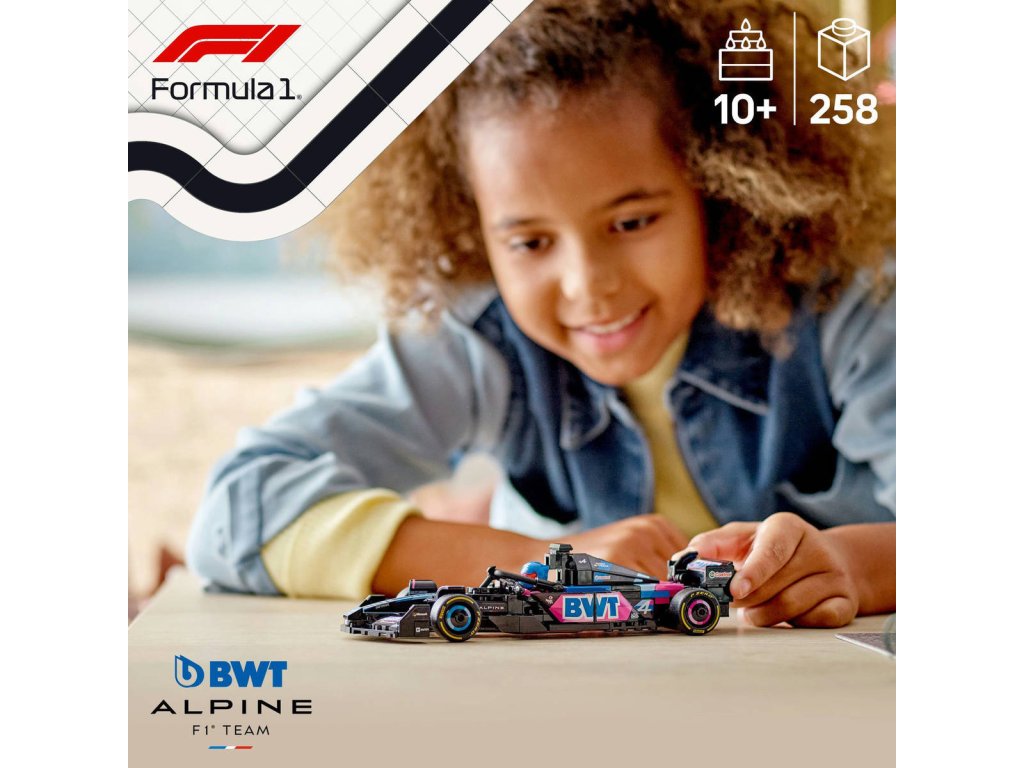 LEGO 77248 - Závodní automobil formule BWT Alpine F1 Team A524 z produktové řady LEGO SPEED CHAMPIONS. Kvalitní dětská plastová stavebnice.Kluci a holky od 10 let, kteří mají rádi závody Formule 1, se můžou těšit na hodiny závodění se stavebnicí Závodní auto BWT Alpine F1® Team A524. Děti i dospělí sběratelé aut si postaví a vystaví závodní model auta F1, které se pyšní designovými prvky inspirované skutečným vozem, který soutěžil v Mistrovství světa Formule 1 v roce 2024. Tento model vozu F1 má kokpit, který lze otevřít zvednutím svatozáře, zadní křídlo, rovnoběžníkovou nápravu, polepy sponzorů a širší zadní pneumatiky s nápisem „Pirelli“. Součástí závodního auta je také minifigurka jezdce v outfitu Alpine s okřídlenou helmou, kterou můžete umístit do kokpitu.