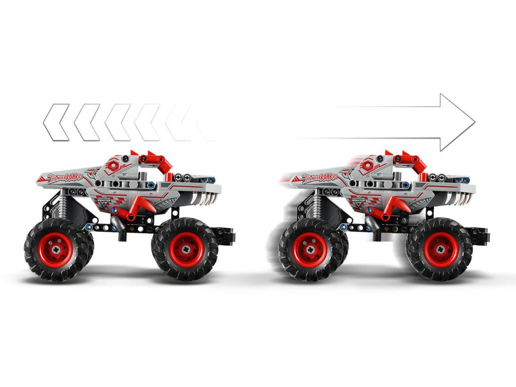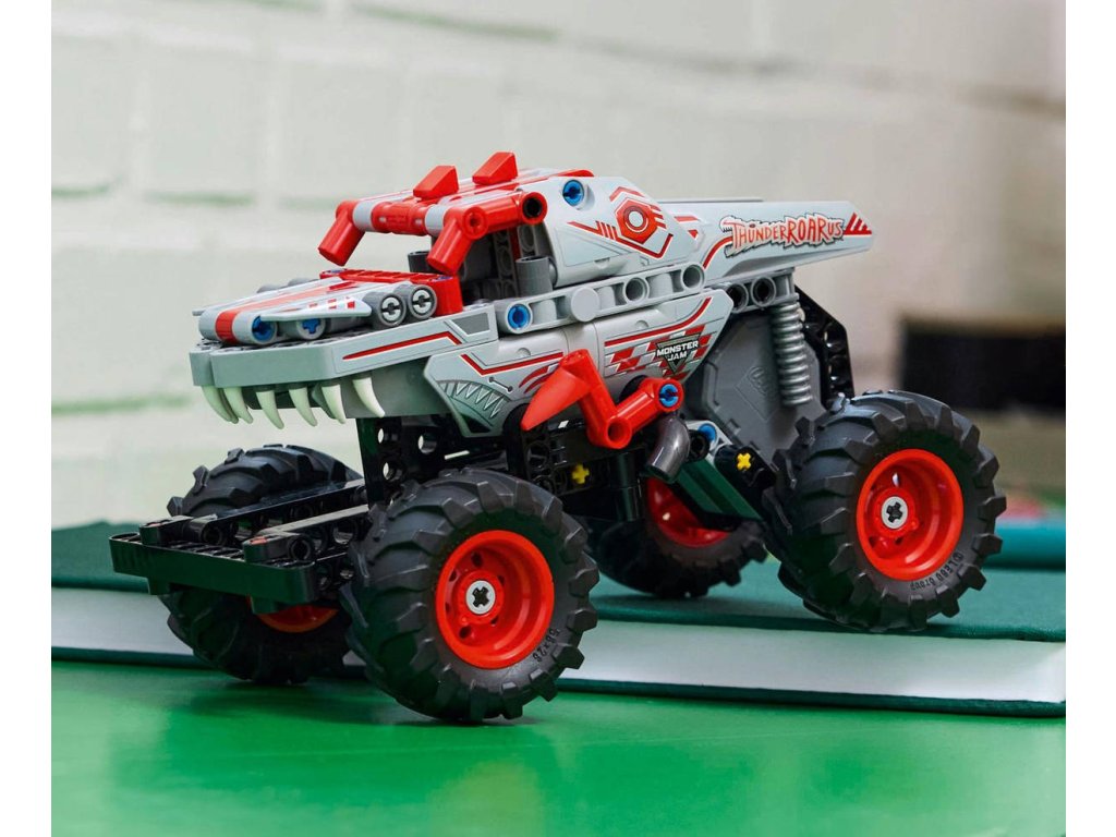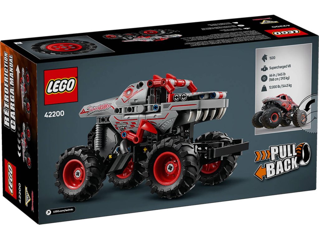 LEGO 42200 - Auto Monster Jam ThunderROARus na zpětný chod, z produktové řady LEGO TECHNIC - Dětská plastová stavebnice v krabici.Představujeme natahovací truck, který nadchne fanoušky Monster Jam od 7 let. Stavebnice Monster Jam ThunderROARus s natahovacím motorem pro kluky a holky se pyšní zábavnou natahovací funkcí. Děti si připomenou napínavé okamžiky z arény, nastartují dinosauří truck a předvedou světu rychlé triky se svými oblíbenými monster trucky. Tato propracovaná stavebnice monster trucku se pyšní s poutavou grafikou s hroty, šupinami a zuby, jako skutečný ThunderROARus – hvězda Monster Jamu inspirovaná dinosaury!