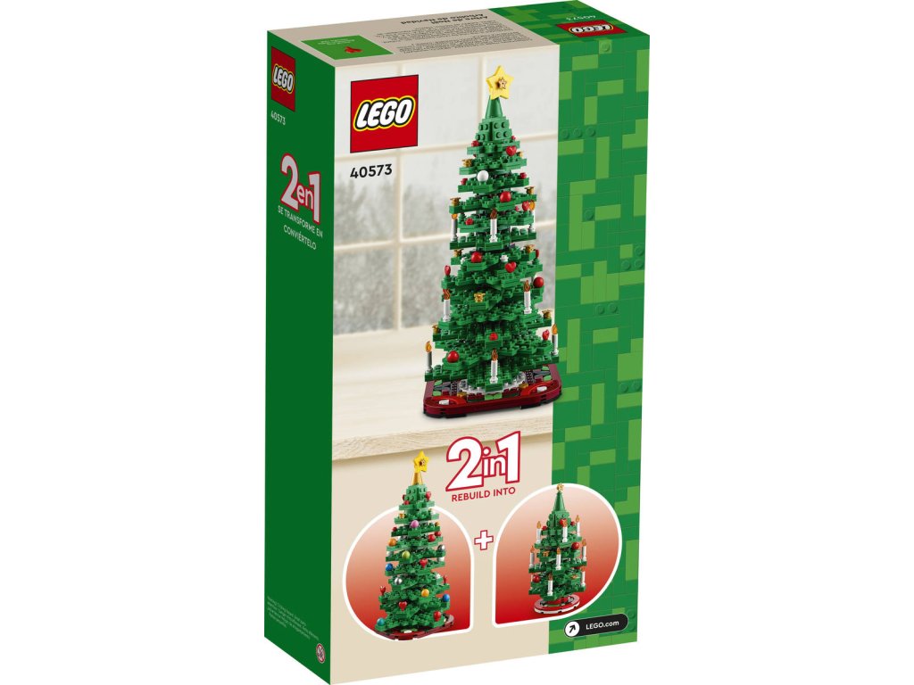 LEGO 40573 - Vánoční stromek. Dětské plastové kostky v krabici. 2in1.Vytvořte poutavou sváteční výstavku se stavebnicí Vánoční stromek. Barevný stromeček se pyšní ozdobami a svíčkami a stojí na ozdobné podložce. Umístěte na vrch žlutou hvězdu, aby vašemu stromečku nic nechybělo. Tato stavebnice 2 v 1 umožňuje sestavit buď jeden velký stromek, nebo dva malé stromečky.