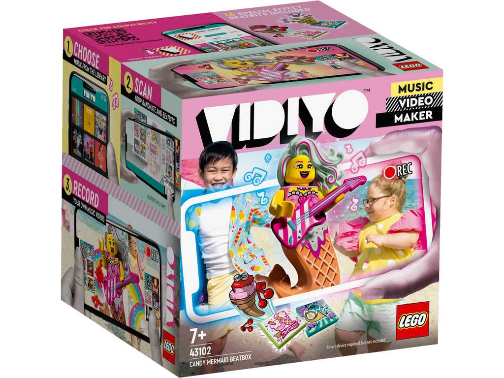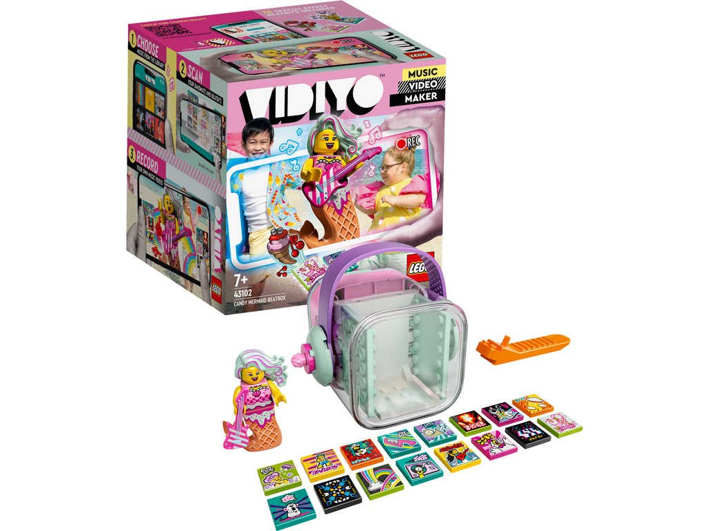 LEGO 43102 - Candy mermaid BeatBox z produktové řady LEGO VIDIYO. Dětské plastové kostky v krabici.Vstupte do světa videoklipů a hudebních hvězd. Sada LEGO VIDIYO Candy Mermaid BeatBox přináší vzrušující herní zážitky. Stáhněte si aplikaci, naskenujte minifigurku mořské panny a předveďte